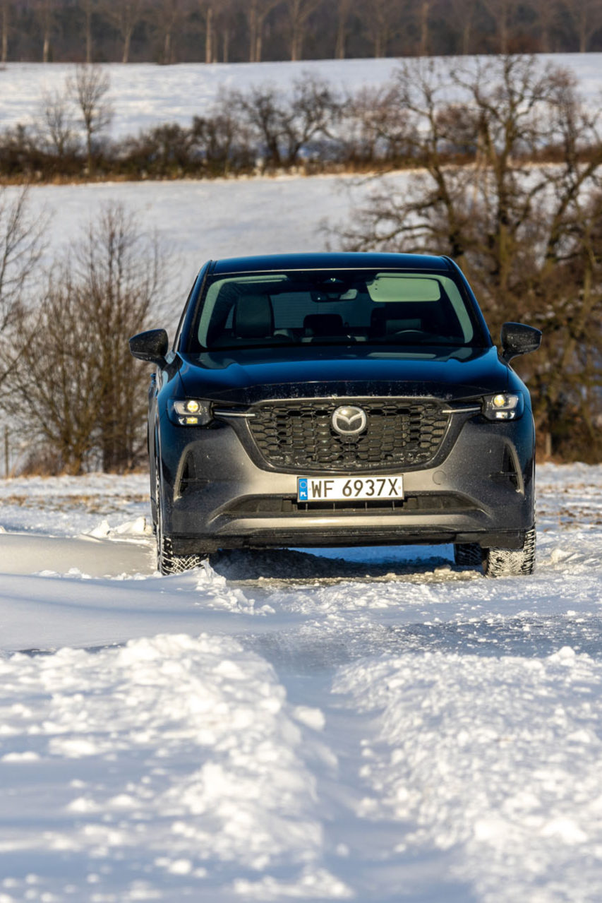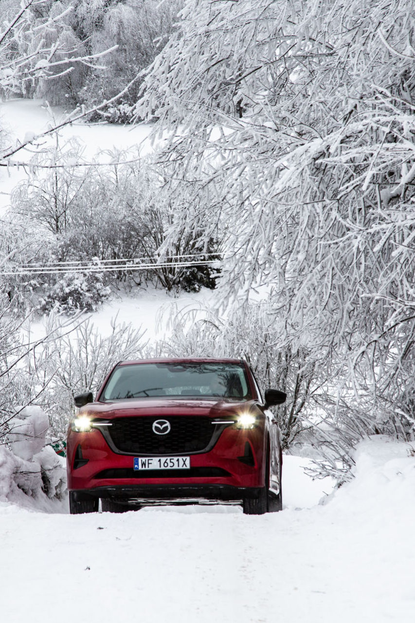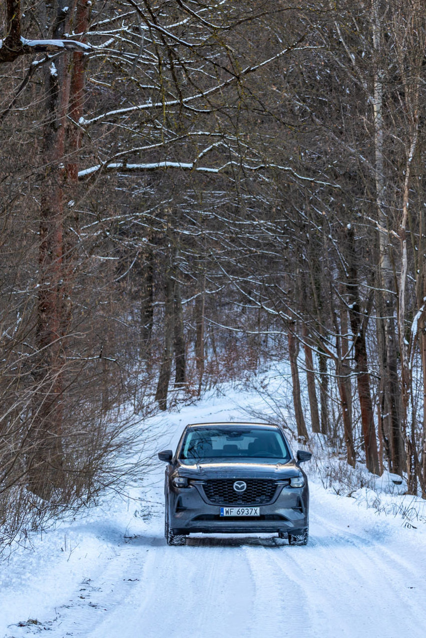 Jeździłem głównie bocznymi drogami. Przy kilku z nich ustawiono znaki, że są nieutrzymywane w okresie zimowym (czyt. pług tam nie zagląda). Nie mogłem sobie wymarzyć lepszych warunków do moich testów. Zaufanie do auta najlepiej buduje się przez doświadczenie. Czułem się trochę jak na poligonie doświadczalnym, na którym raz po raz mazda zdawała kolejne testy. Niestraszny okazał się dla niej głęboki śnieg – to zasługa prześwitu. Ruszanie na śliskim podłożu pod górkę zdała bez problemu. Jedyne momenty, w których miałem większe obawy, to te, gdy czułem, że pod śniegiem jest miękkie podłoże. Masa auta robi swoje i dość łatwo można się w takich warunkach zakopać. Stare powiedzenie mówi, że terenowość auta mierzy się w odległości, jaką idzie się do najbliższej wsi po traktor. Mazda CX-60 oszczędziła mi takich przygód.