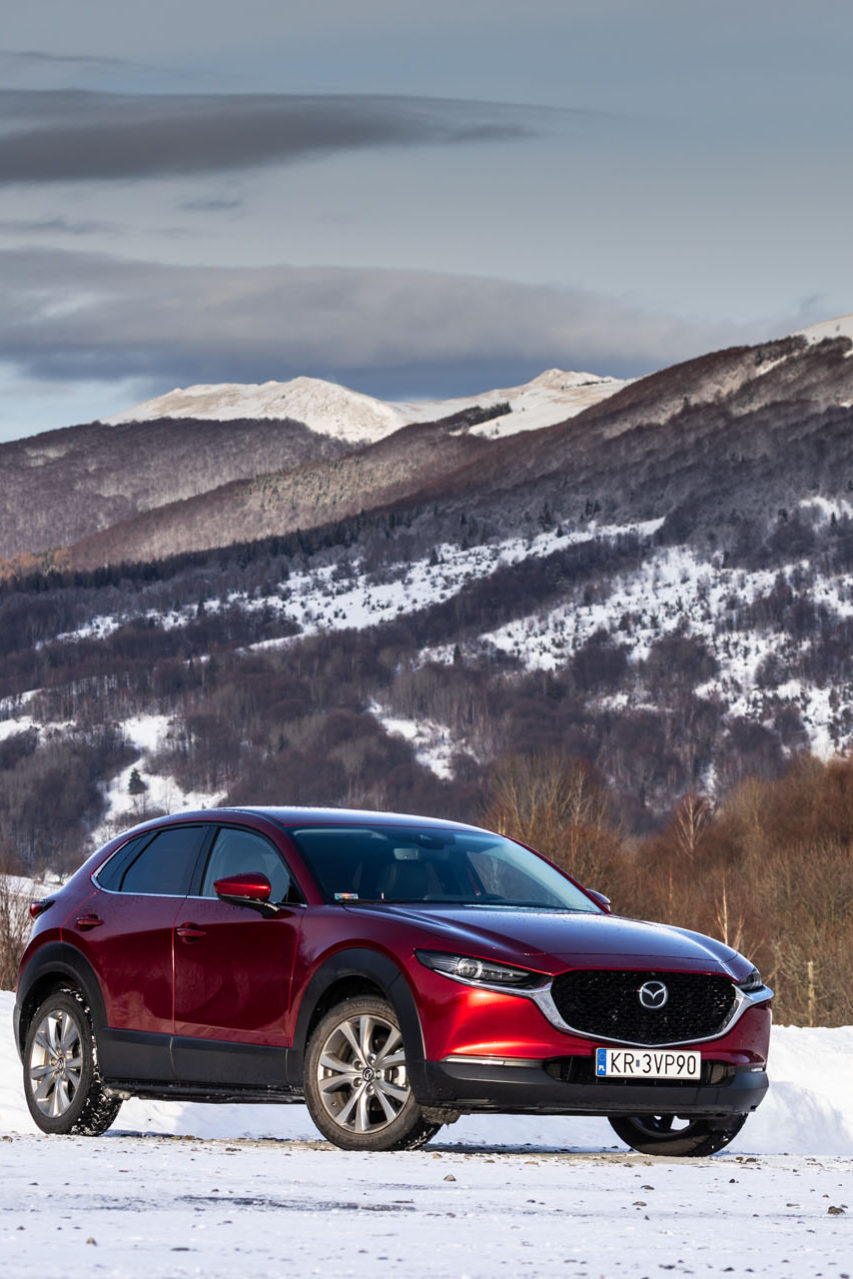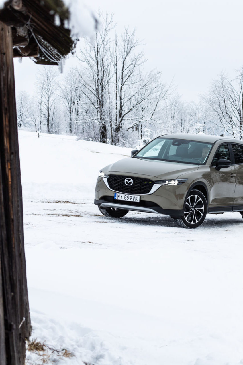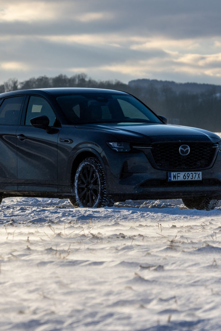 Jeździłem głównie bocznymi drogami. Przy kilku z nich ustawiono znaki, że są nieutrzymywane w okresie zimowym (czyt. pług tam nie zagląda). Nie mogłem sobie wymarzyć lepszych warunków do moich testów. Zaufanie do auta najlepiej buduje się przez doświadczenie. Czułem się trochę jak na poligonie doświadczalnym, na którym raz po raz mazda zdawała kolejne testy. Niestraszny okazał się dla niej głęboki śnieg – to zasługa prześwitu. Ruszanie na śliskim podłożu pod górkę zdała bez problemu. Jedyne momenty, w których miałem większe obawy, to te, gdy czułem, że pod śniegiem jest miękkie podłoże. Masa auta robi swoje i dość łatwo można się w takich warunkach zakopać. Stare powiedzenie mówi, że terenowość auta mierzy się w odległości, jaką idzie się do najbliższej wsi po traktor. Mazda CX-60 oszczędziła mi takich przygód.