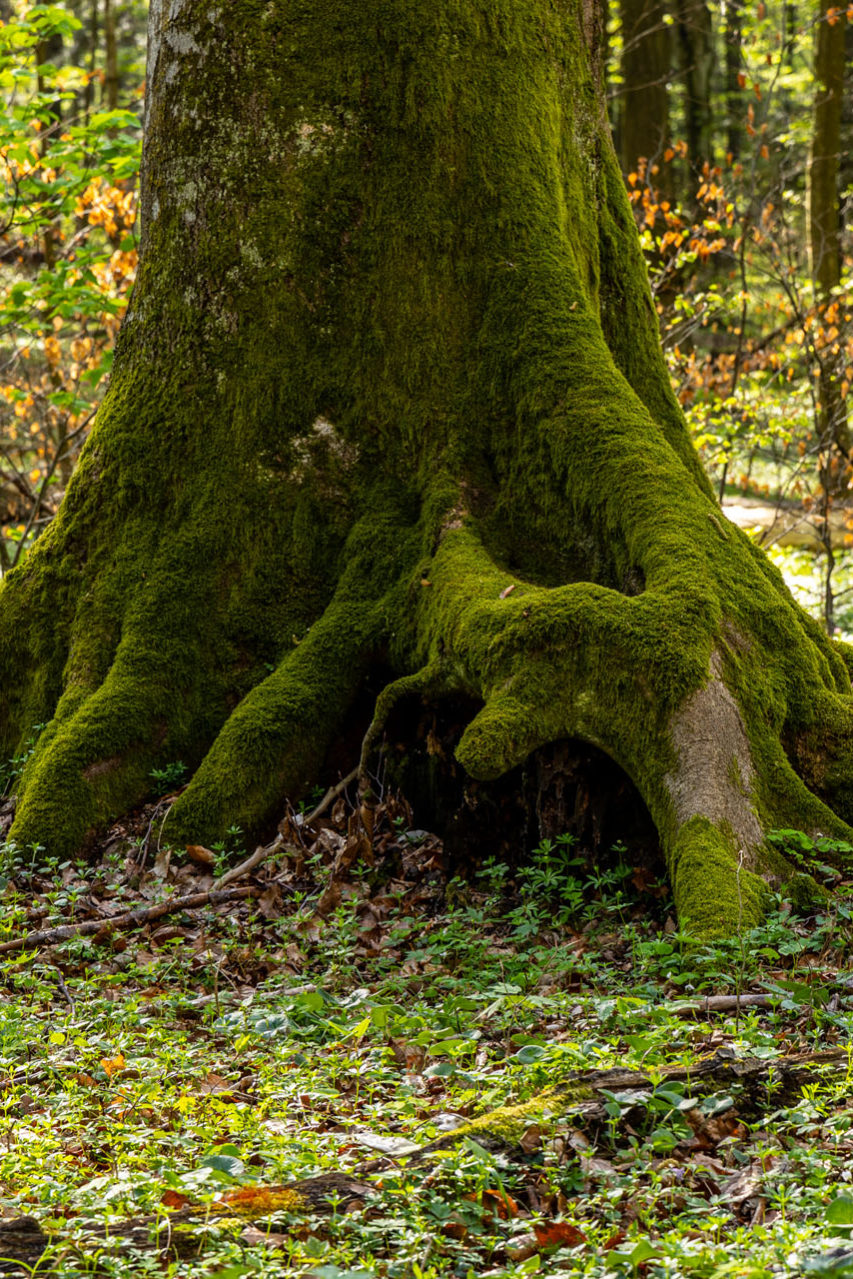 Czerwony szlak praktycznie przez cały czas wiedzie szeroką drogą szutrową. Im dalej od cywilizacji, tym robi się piękniej. Nawet nie wiem, w którym momencie znalazłem się otoczeniu iście gotyckiego lasu, w którym potężne buczyny wyglądały niczym filary w świątyni natury. Był to znak, że dotarłem do do obszaru ochrony ścisłej Jarugi. Muszę przyznać, że pracownik parku mówił prawdę, że jest to piękniejsze miejsce od popularnej Bukowej Góry obok Zwierzyńca. Pierścień lasu stanowi naturalny filtr, więc słuchać jedynie szum drzew i śpiew ptaków. Może urok tego miejsca polega na tym, że jest to obszar ochrony ścisłej i obowiązuje na nim całkowite zaniechanie bezpośredniej ingerencji człowieka w stan ekosystemów i procesów przyrodniczych. Dalej droga pnie się przez długi odcinek w górę, czego się nie czuje aż do momentu, w którym rozpoczyna się długi zjazd do Gajówki Krzywe.