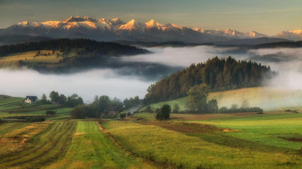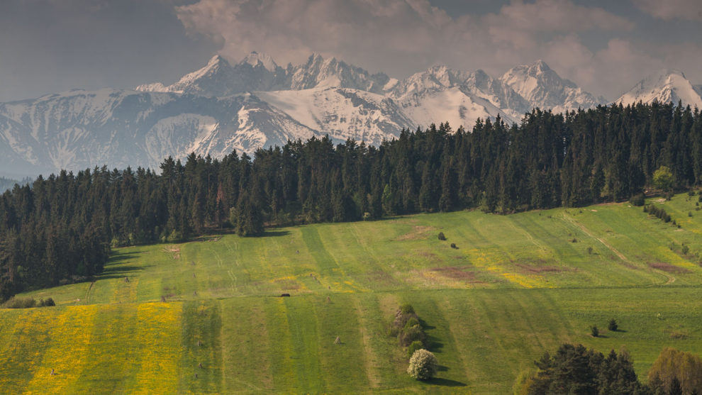 Trudno było nam wybrać jedno miejsce, z którego Tatry najlepiej prezentują się z okna samochodu. Wybór padł na Sromowce Wyżne. Punkt widokowy znajduje się tam przy głównej drodze i nie jest to niestety zorganizowany parking, a raczej szeroko rozjeżdżone pobocze. Bezpieczny wjazd na nie znajduje się od strony Czorsztyna. Po wyjechaniu z lasu na otwartą przestrzeń po prawej stronie widać pas ziemi, gdzie można się zatrzymać (podkreślamy – chodzi o punkt po wyjeździe z lasu, po drodze mija się jeszcze dwa inne). Nie da się tego miejsca przeoczyć. Sporo kierowców ściąga tu nogę z gazu, bo widok jest imponujący. Przed oczami na wschodzie mamy łagodne pienińskie szczyty, a po prawej stronie na południu ostrą grań Tatr Wysokich. Nim skupimy się na Lodowym Szczycie czy Łomnicy, można błądzić wzrokiem po urokliwych polach, które stykają się ze strzelistymi górami.