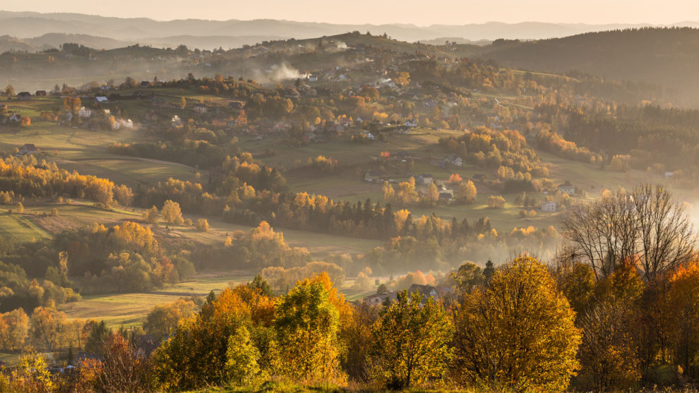 Kto pragnie zobaczyć malownicze Beskidy, ten nie zawiedzie się przy górnej stacji kolejki Złoty Groń. Dojazd jest bardzo dobrze oznakowany i warto zwracać uwagę na tabliczki prowadzące do położonego tuż obok hotelu Złoty Groń Resort & Spa. Nasz punkt widokowy znajduje się na rozległym parkingu, gdzie z okien samochodu zobaczyć można krainę jak z bajki. Rozsiane po łagodnych wzgórzach domki w świetle zachodzącego słońca tworzą niesamowity krajobraz. Niech nie zmyli Was mała atrakcyjna droga do celu. Magia tego zakątka polega na tym, że dopiero z odpowiedniej wysokości zobaczyć można piękno Beskidów. Koniaków, Istebna i Jaworzynka prezentują się z tego miejsca spektakularnie.