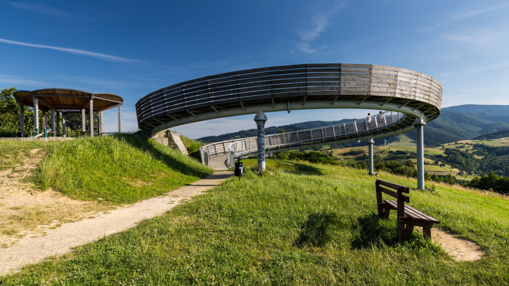 Na zbocza doliny Popradu przyciąga nas Ślimak, czyli oryginalny punkt widokowy w samym sercu Sądecczyzny. Przy głównej drodze zwykły drogowskaz „Punkt widokowy w Woli Kroguleckiej” nie wygląda zachęcająco. Gdyby jednak w jego miejscu postawić baner z widokiem ze Ślimaka, to wydaje się nam, że władze gminy musiałyby wybudować kolejną drogę dojazdową. Już teraz ruch na platformie jest całkiem spory – w weekendy dojechać można tylko do parkingu przy szosie, a resztę drogi do celu (ok. 5 minut) trzeba przebyć pieszo. Dlaczego to miejsce działa jak magnes? Widoki mówią same za siebie. Na pierwszym planie widać wspomnianą już dolinę Popradu, a dalej rozciąga się po sam horyzont pasmo gór. Trudno doliczyć się, ile dokładnie linii wzgórz nakłada się na siebie. Rachubę straciliśmy przez jedenastej. Do tego okolica emanuje spokojem. My do szaleństwa zakochaliśmy się w tej panoramie i od zeszłego roku byliśmy tam ponownie 4 razy!