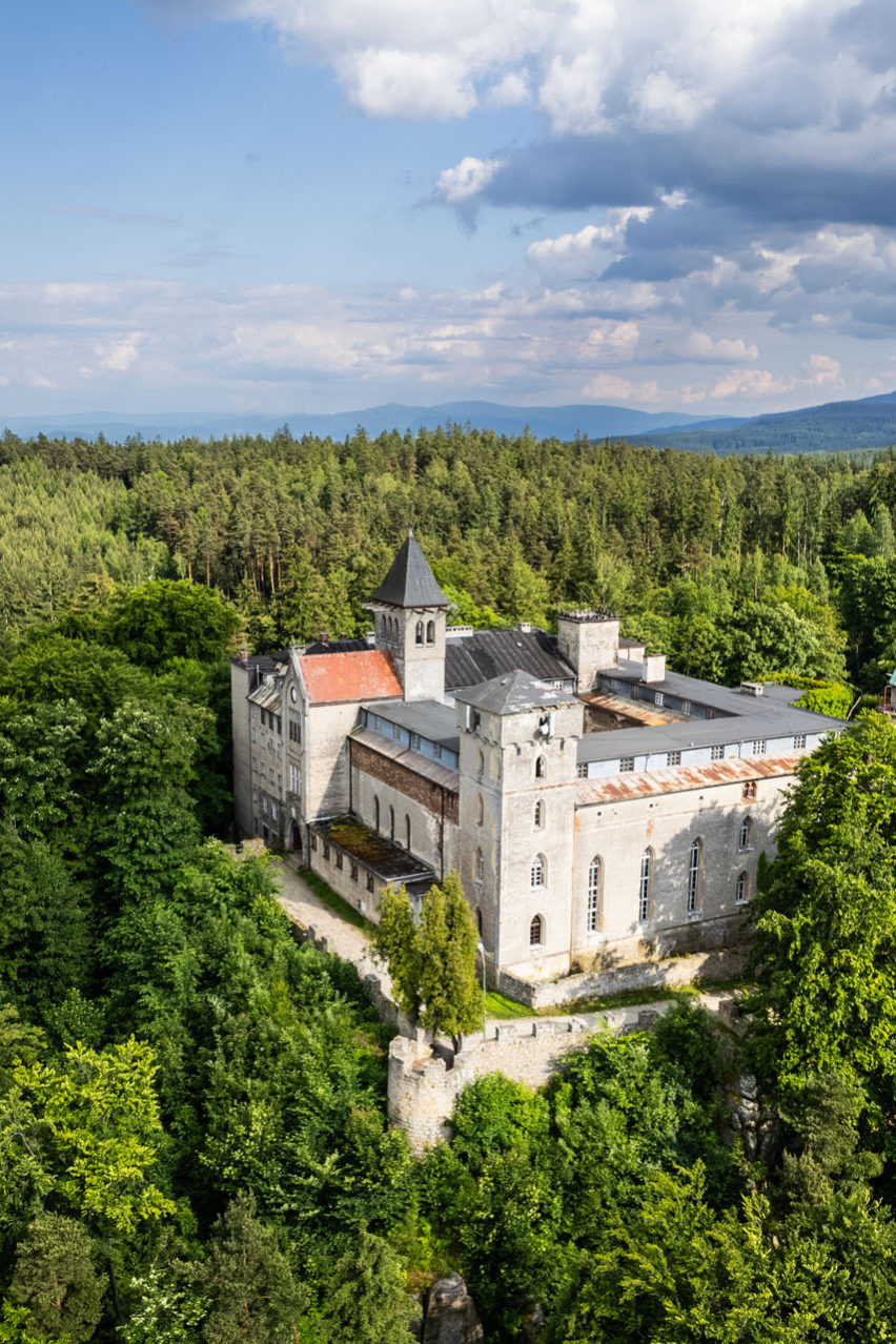 Przez wiele lat kierowcy podążający drogą nr 8 przez Szczytną spoglądali na sylwetkę zamku ulokowanego na szczycie wzgórza nad miastem. Wśród skał w pierwszej poł. XIX w. wzniesiono tam piękną rezydencję. Architektura zamku może sugerować, że jest to dużo starsza budowla, ale to właśnie umiejętna gra stylów nadała jej taki charakter. Przez niemal dwa wieki zamek był niedostępny dla turystów. Początkowo służył znamienitym rodom, a po II wojnie światowej pełnił różne funkcje. Do 2020 r. działał w nim dom opieki społecznej. W jego wnętrzach nadal widać ślady wieloletnich zaniedbań i dewastacji. Fundacja, pod której skrzydła trafił zamek, dokłada starań, żeby udostępniać turystom kolejne zakamarki. Spacerując po terenie dookoła, warto zajrzeć również do zabytkowej kaplicy zamkowej wkomponowanej w budowlę. Z tarasów widokowych rozsianych po wzgórzu roztacza się piękna panorama okolicy.