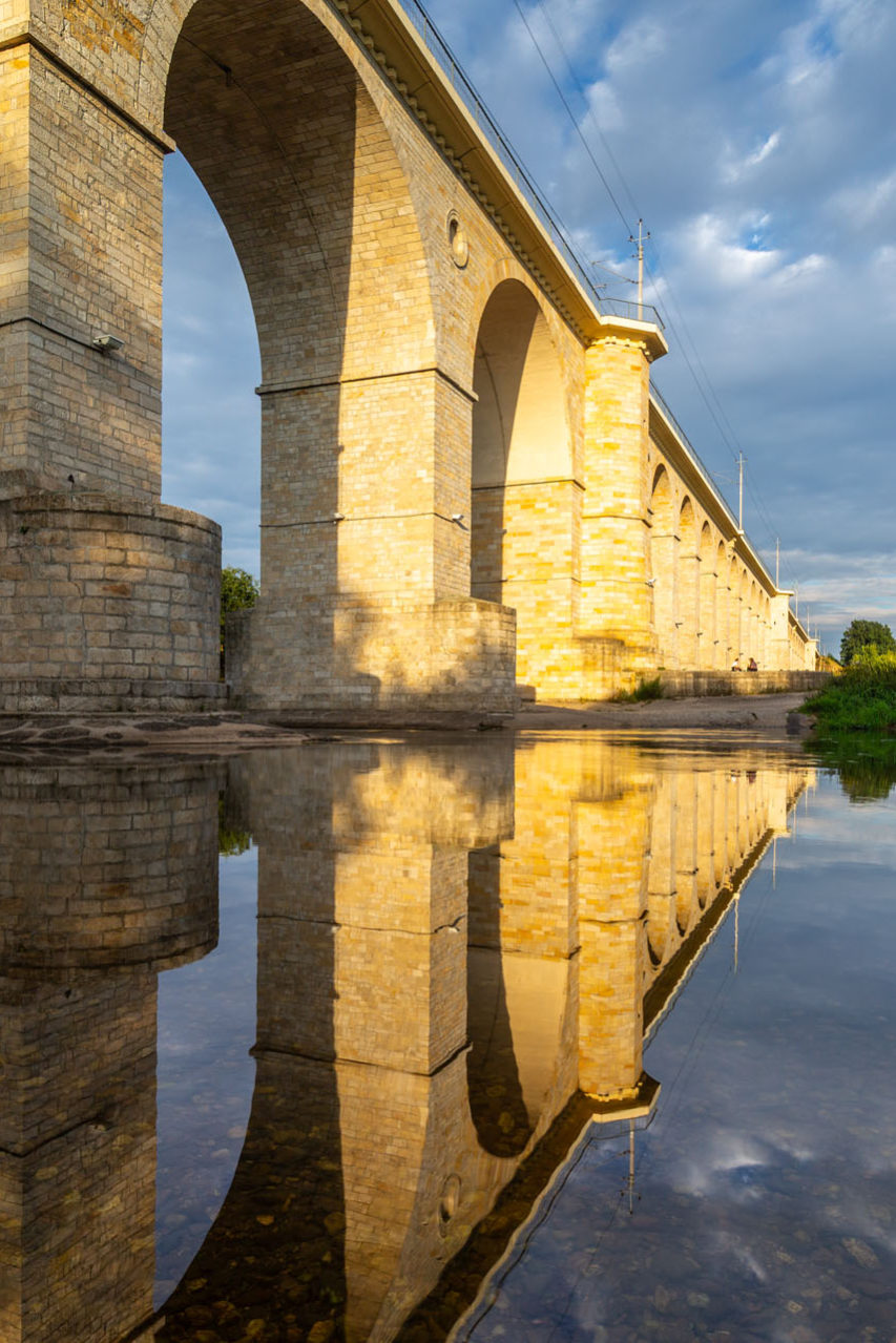 Atrakcją, po którą przebiega dzisiaj droga nr 94, jest także wiadukt kolejowy. Wykonany w 1846 roku z piaskowca kredowego ma 490 m długości. Posiada 35 przęseł i mieszczą się na nim dwa torowiska. Dzięki niemu pociągi pokonują rzekę Bóbr. Jest to jeden z najdłuższych wiaduktów tego typu w Europie. W pobliżu mostu utworzono ścieżki spacerowe, a jego rozległe przęsła służą mieszkańcom za miejsca spotkań w czasie dobrej pogody. Wiadukt najlepiej prezentuje się z zachodniego brzegu rzeki (dojście od ul. Ceramicznej).