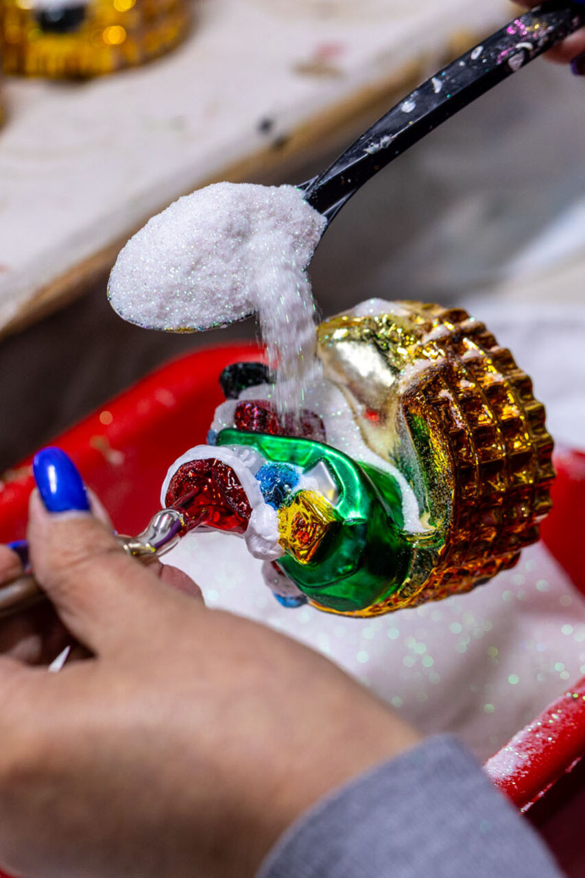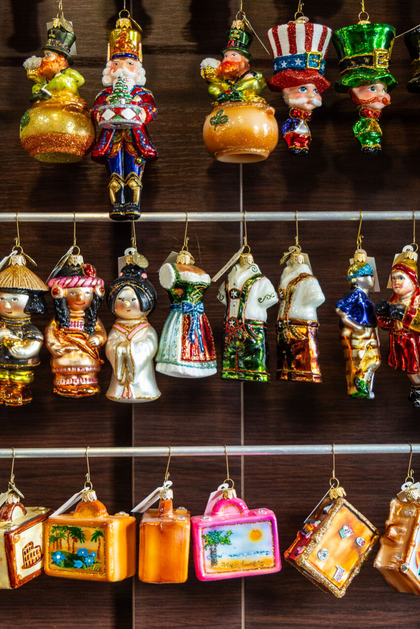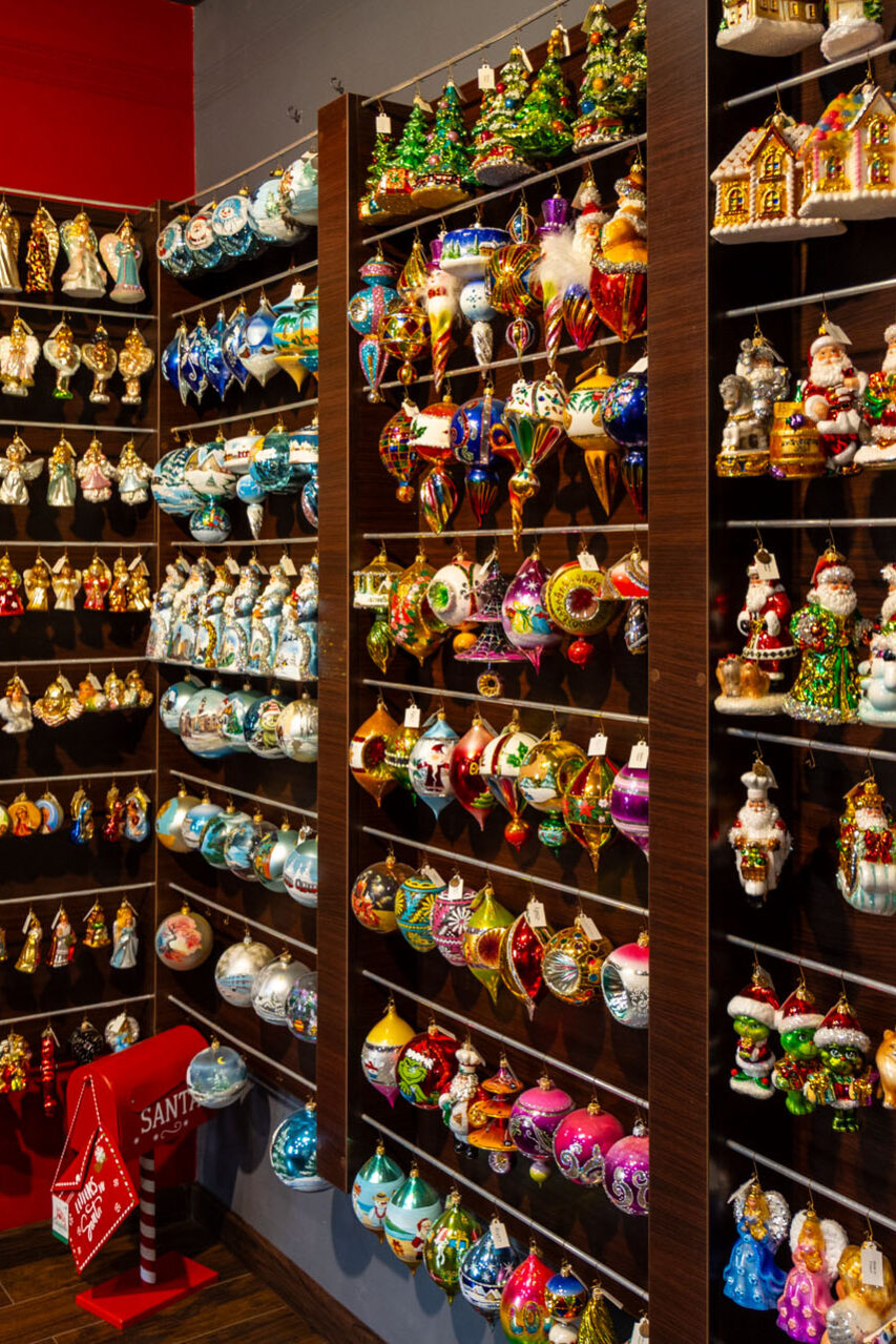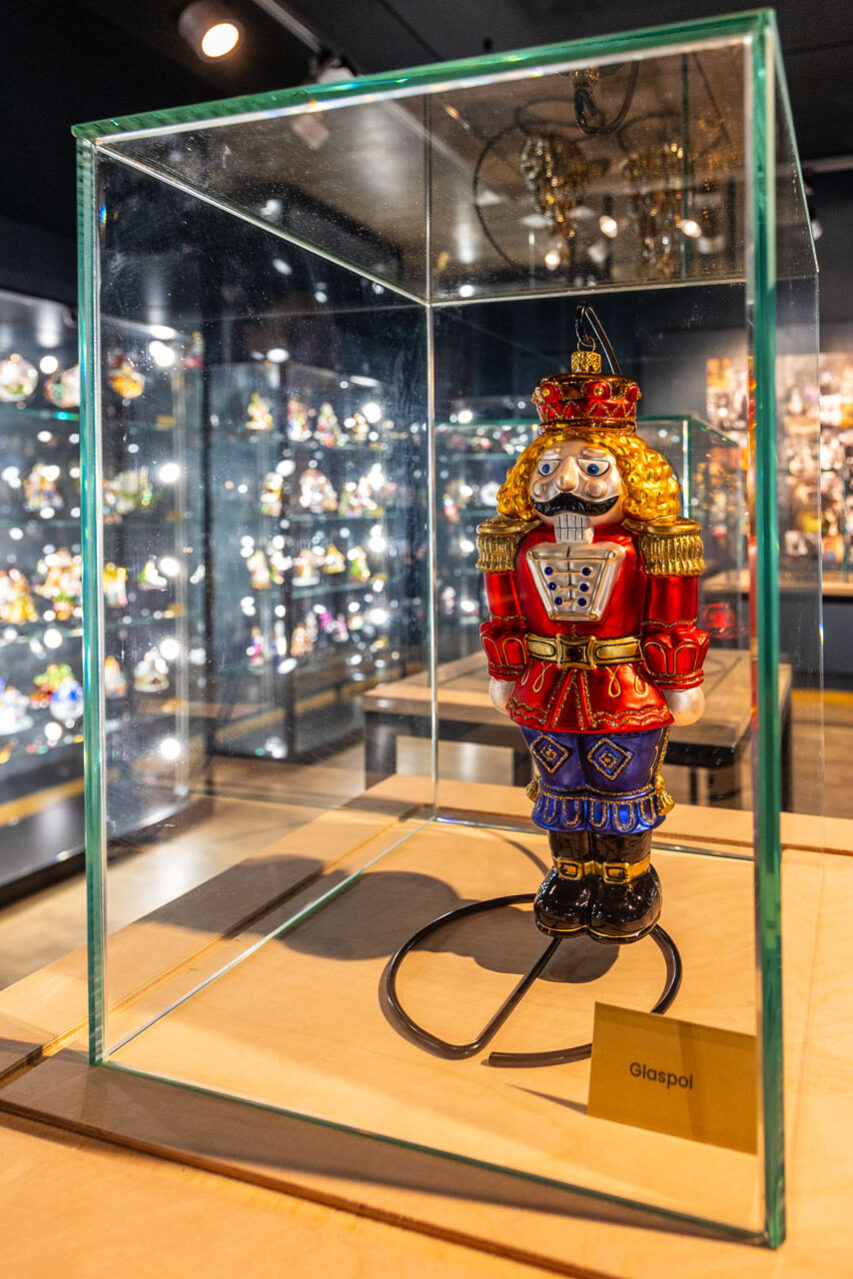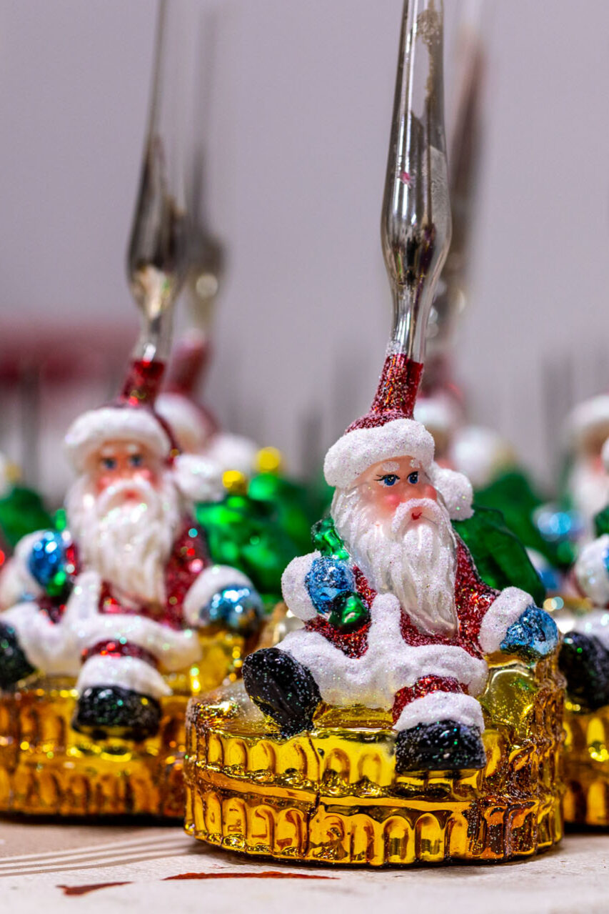 Ze sklepu, w którym mieści się kasa, poszedłem piętro wyżej. No i przepadłem! Trudno będzie mi słowami opisać klimat tej przestrzeni, bo nigdy wcześniej czegoś takiego nie widziałem. Z jednej strony są tam gabloty z przepięknymi bombkami, ale są tam również liczne stanowiska, przy których własnoręcznie pracuje się nad ozdobami choinkowymi.