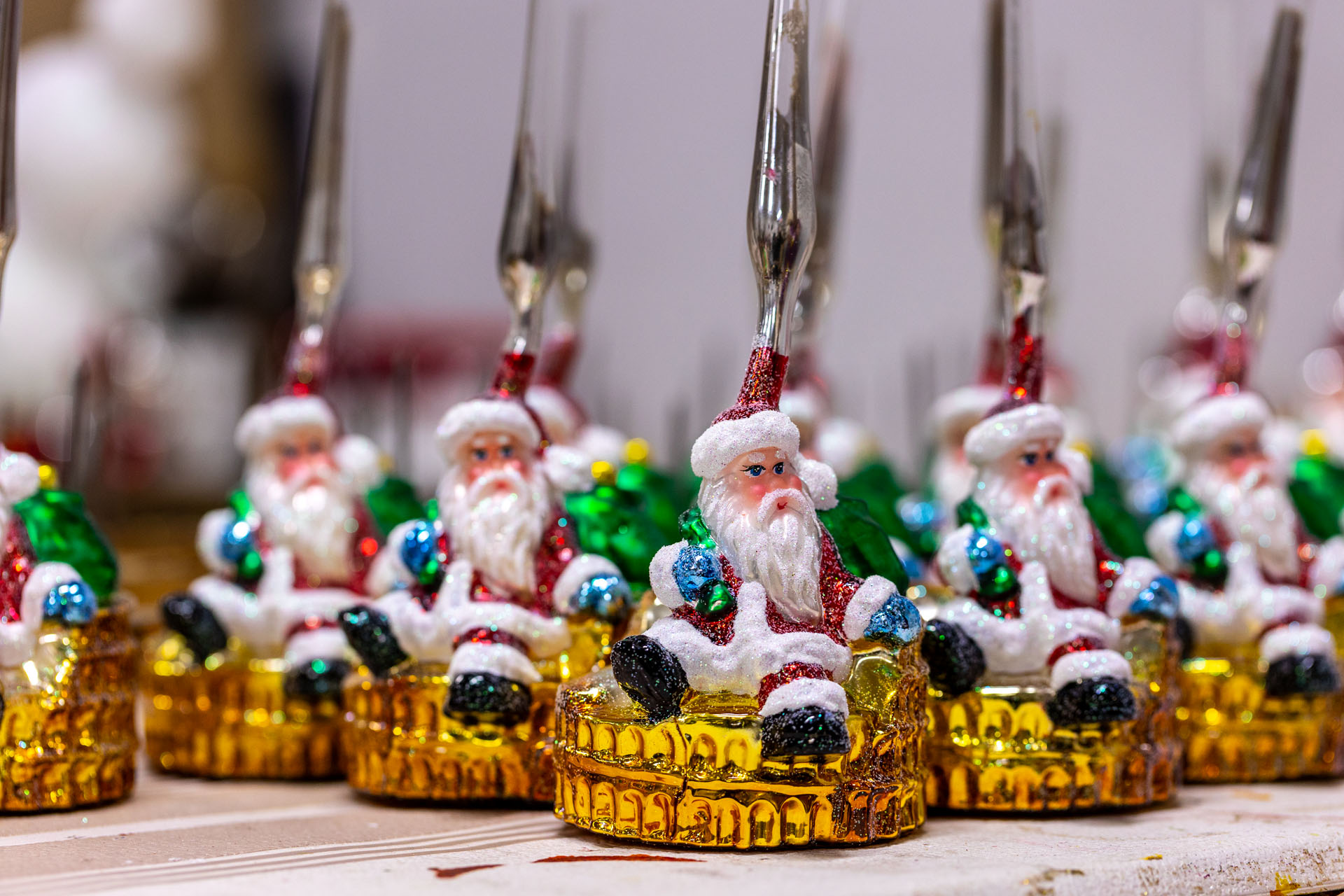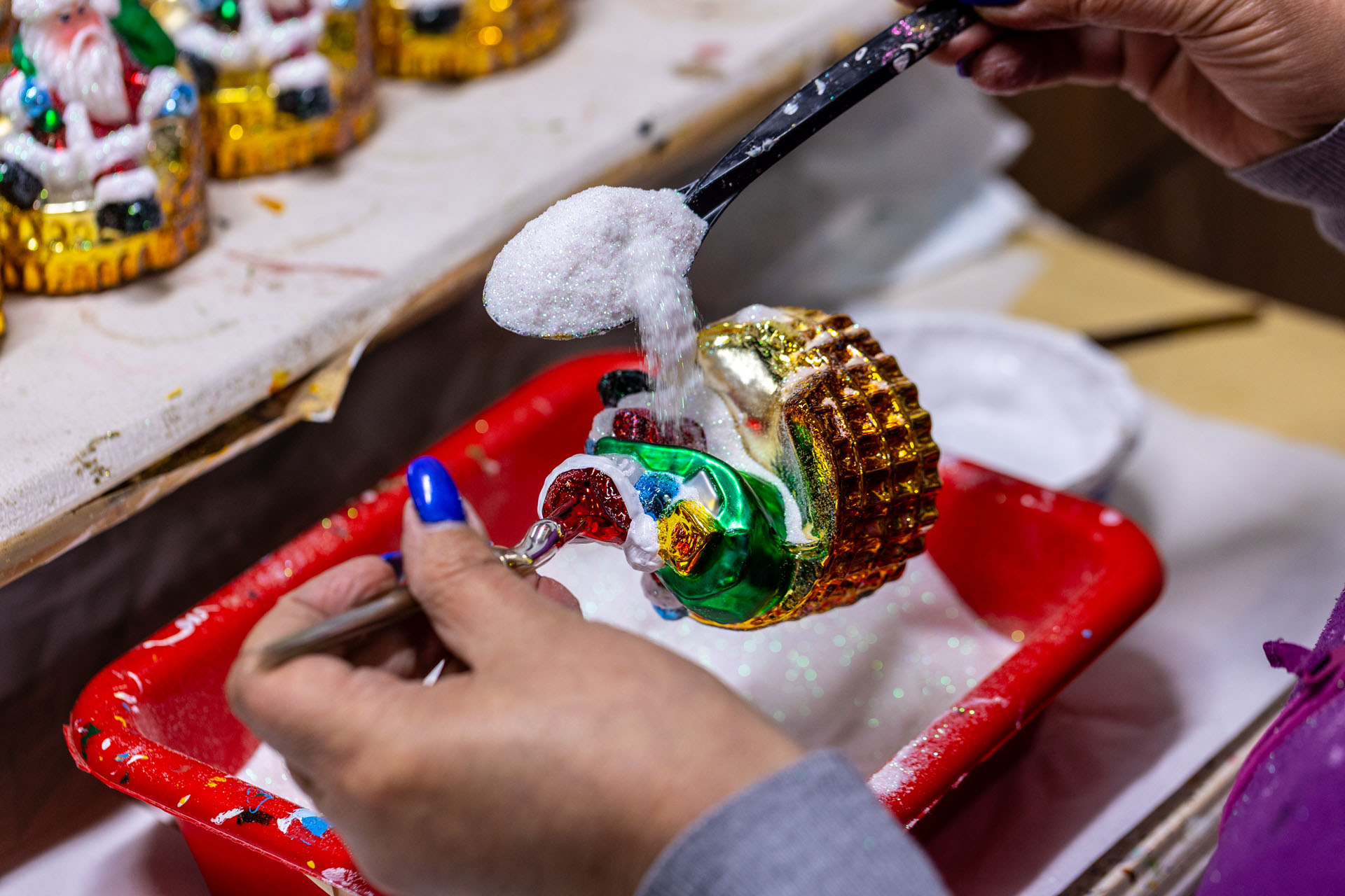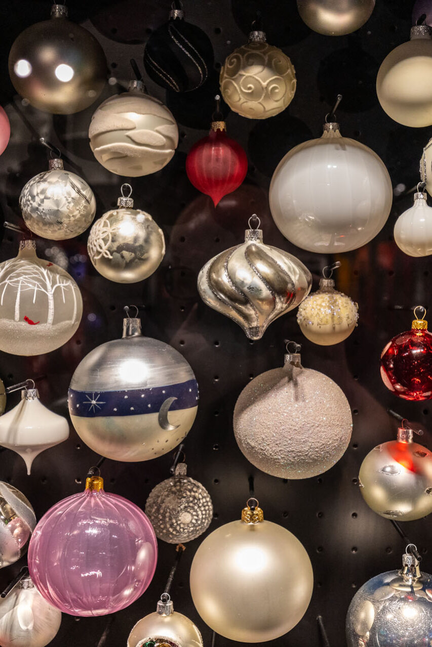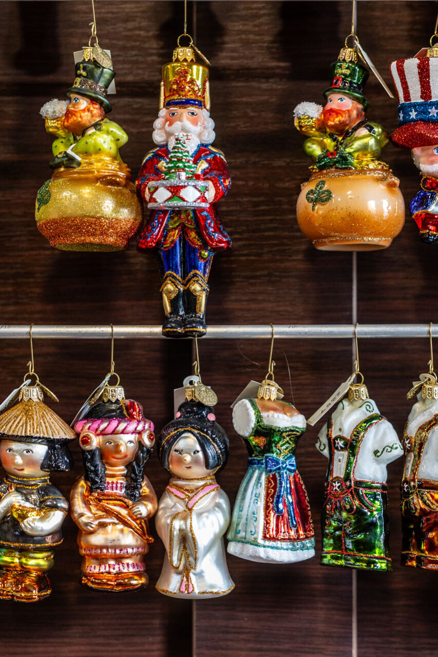 Ze sklepu, w którym mieści się kasa, poszedłem piętro wyżej. No i przepadłem! Trudno będzie mi słowami opisać klimat tej przestrzeni, bo nigdy wcześniej czegoś takiego nie widziałem. Z jednej strony są tam gabloty z przepięknymi bombkami, ale są tam również liczne stanowiska, przy których własnoręcznie pracuje się nad ozdobami choinkowymi.