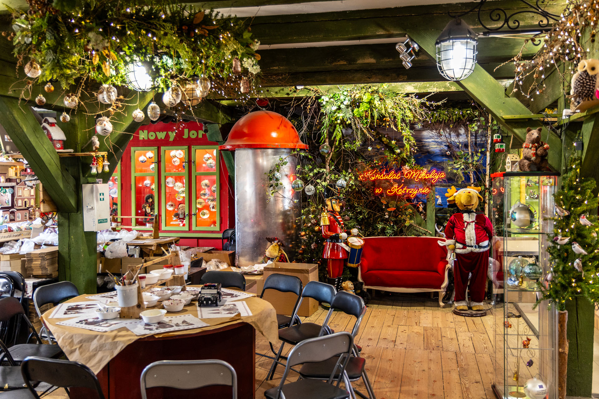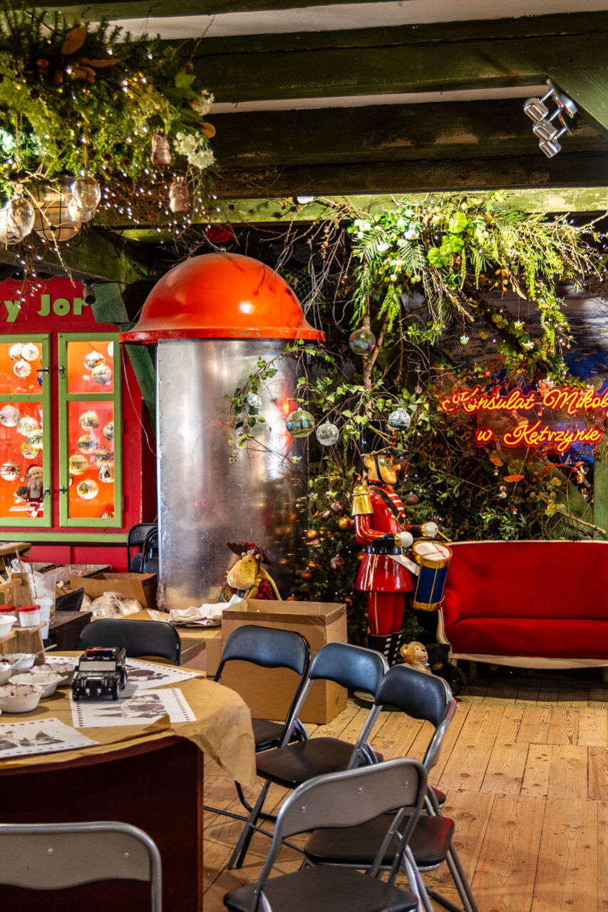 Nie brałem udziału w warsztatach, ale mogłem obserwować je z boku, bo równolegle ze mną konsulat zwiedzała rodzinka z dzieciakami. Ileż tam było radości i zabawy przy ozdabianiu! Już na tym pierwszym piętrze zrozumiałem, dlaczego przez Konsulat Świętego Mikołaja nie da się „przebiec”. To nie jest atrakcja typu „instant” – zobacz, zrób zdjęcie i zapomnij. Mnie porwał ten magiczny świat. Dla przypomnienia: za oknem upał i końcówka wakacji, a ja czułem się jak w grudniu!