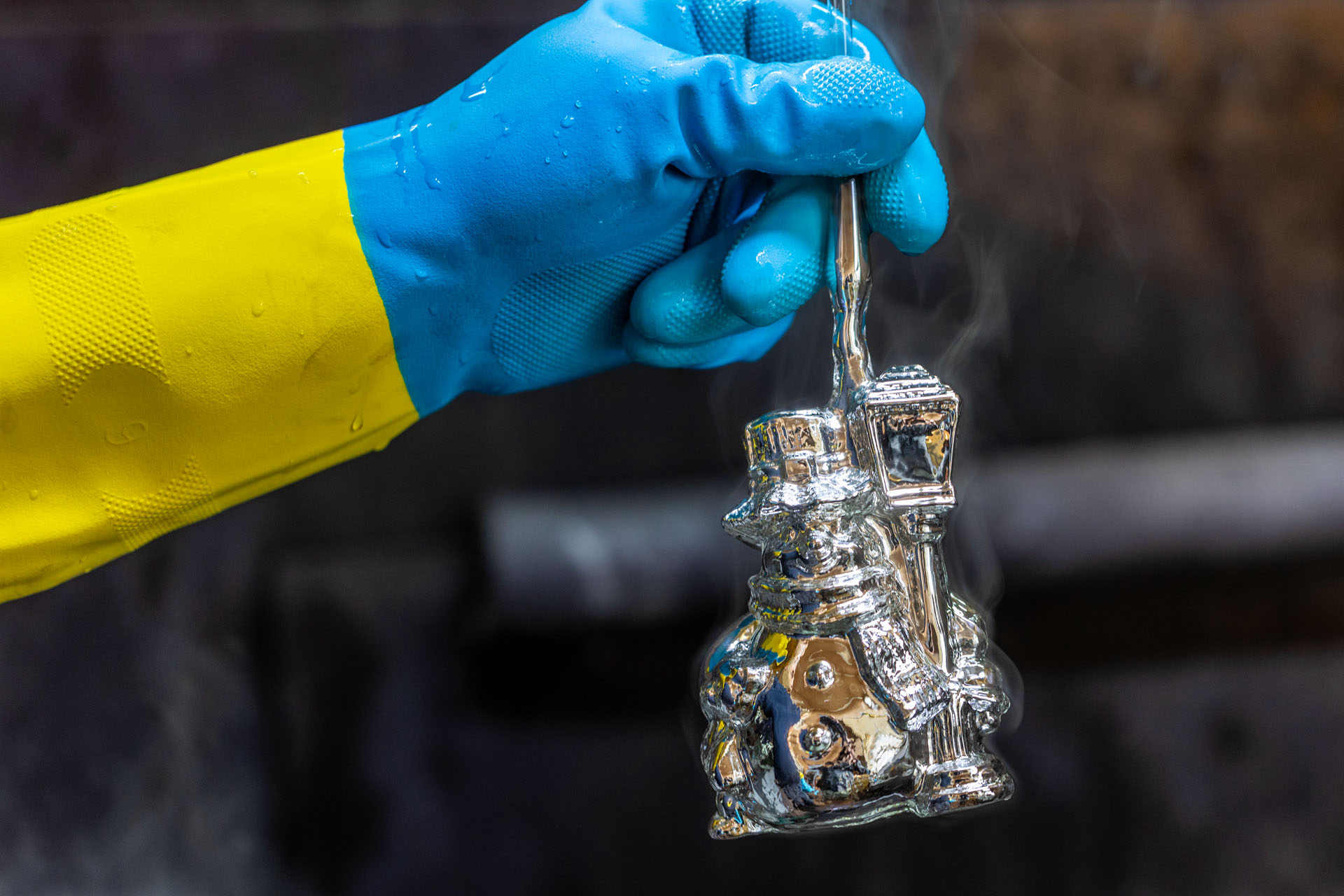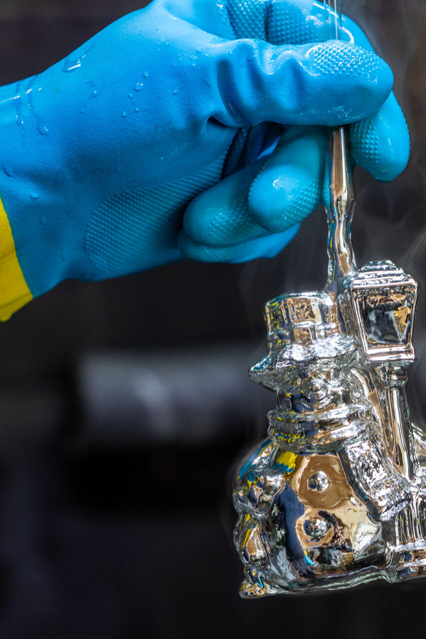 Tu mówimy przecież o formach w przeróżnych kształtach – owocach, samochodach, kilku postaciach, budowlach… Nim dojdzie się do etapu wdmuchiwania powietrza, trzeba zaprojektować i wykonać formę, która umożliwi wykonanie bombki. Muszą być w niej wykonane grawery i odpowiednie łączenia, bo każda z części formy musi podnieść się w tym samym momencie, żeby uwolnić bombkę po wydmuchaniu. Co więcej, nie ma mowy o tym, żeby zostały jakieś ślady po łączeniach części! Kiedy pani Agnieszka pokazała mi z bliska jedną z takich form złożonych z pięciu części, nie mogłem uwierzyć, że z tej bezkształtnej masy metalu może powstać tak piękne szklane dzieło.