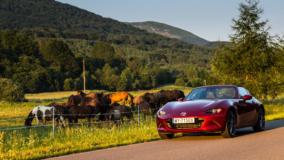 Od początku projektu Slow Road miałem dwa marzenia: objechać Tatry dookoła i przejechać Wielką pętlę bieszczadzką z otwartym dachem Mazdy MX-5. Pierwsze spełniłem jesienią 2018 roku, a drugie latem 2019 roku. Kiedy opublikowałem zdjęcie z trasy w Bieszczadach, wiele osób powątpiewało i podśmiewało się z mojego pomysłu. Góry kojarzyły się im raczej z napędem 4×4 i wysokim zawieszeniem. Ja miałem jednak inny plan. Chciałem po prostu delektować się jazdą. Otworzyć dach, jechać powoli i nasycać się nie tylko widokami, ale także cudownym zapachem letnich ziół i świeżością lasu. Nie marzyły mi się dzikie Bieszczady. Obrałem sobie za cel odbyć niespieszną podróż przez tę krainę. Mazda MX-5 okazała się do tego samochodem idealnym. Wiem, że wielu miłośników pieszych wędrówek patrzyło na mnie z pogardą. Burzyłem przecież ich wizję Bieszczad. Gdyby jednak porzucili przekonanie, że za czasów, gdy kursował tu jeden PKS przez cały dzień, było dobrze, i zaakceptowali fakt, że świat się zmienił, to może byłoby im łatwiej. Może wtedy dostrzegliby, że czas porzucić Połoninę Wetlińską i uciec gdzieś w lasy koło Baligrodu czy Komańczy. Podróż po Bieszczadach z otwartym dachem zmieniła moje poglądy. Teraz w głowie nucę „Moje Bieszczady”, a podziwiam nasze Bieszczady. Tak żyje się zdecydowanie lepiej.