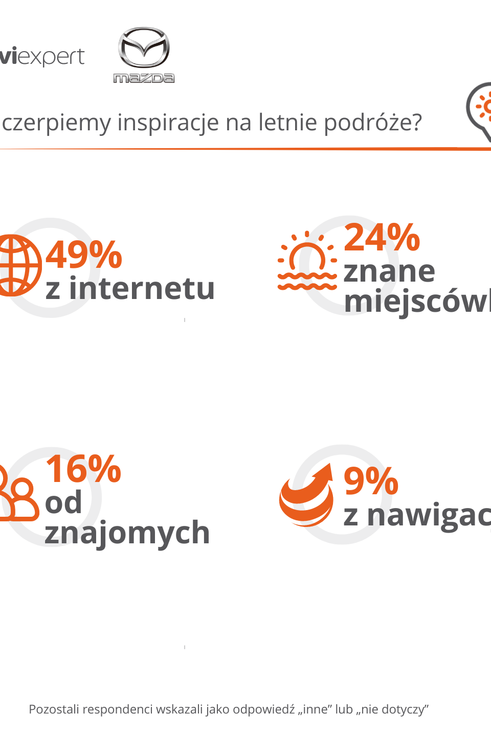 Wypoczynek to aktywność bardzo indywidualna, każdy z nas relaksuje się w innym otoczeniu – dla niektórych będzie to plaża w pakiecie z radosnym gwarem, dla innych rzadko uczęszczany szlak w górach. 49 proc. ankietowanych jest jednak zgodna, że inspiracje czerpie głównie z sieci. 24 proc. wybiera miejscówki, w których już kiedyś było, z kolei 16 proc. polega na poleceniach znajomych. Wśród odpowiedzi nie zabrakło także wpływu rodziny na urlopową destynację, jak np. podporządkowywanie się temu, co powie współmałżonek. 9 proc. jako źródło inspiracji wskazuje nawigację – co, jak zauważa Przybylska, może być zasługą unikatowej bazy miejsc SLOW TRAVEL, którą od kilku lat rozwija Mazda Motor Poland w ramach projektu Slow Road. Slow Road to prawie 80 nieszablonowych tras i 615 urokliwych miejscówek dostępnych w NaviExpert, w ramach osobnej kategorii użytecznych punktów.
