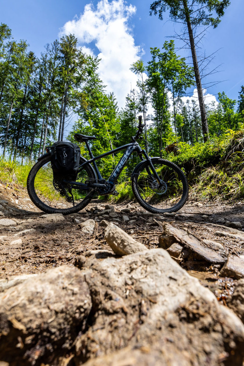 W czasie mojej górskiej przygody na rowerze nie poruszałem się jednak tylko po dobrze znanych mi miejscach. Wybierałem także nowe lokalizacje i przy planowaniu trasy uwzględniałem szlaki rowerowe. Korzystając z serwisu mapy.cz, przy wyborze nakładki turystycznej na mapę widziałem, gdzie zostały wytyczone takie szlaki. Później w sieci szukałem opisów lub relacji, które dały mi możliwość oceny, czy dam radę. Teraz już wiem, że rower Trek Powerfly 5 mógłby dużo więcej, niż od niego wymagałem. Pozostawała jednak sprawa zdrowego rozsądku, odwagi i poczucia bezpieczeństwa.