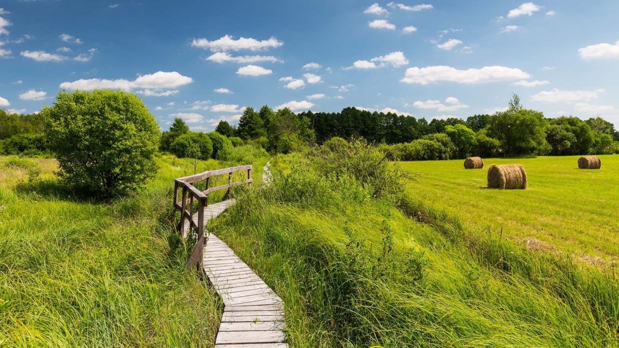 Samochód można zostawić przy ośrodku dydaktyczno-muzealnym, a mając odrobinę szczęścia również tuż po zjechaniu z drogi asfaltowej. Mnie udało się zaparkować bez problemu. Nie ma tam oznaczonego parkingu, ale ustawiony wzdłuż drogi samochód nikomu nie przeszkadza. Dzięki temu można uniknąć wędrowania asfaltem przez całą wioskę. Szeroka polna droga prowadzi wzdłuż letniskowych zabudowań aż do kładki. Nie sposób przegapić tego miejsca. Od tej pory większość trasy ciągnie się po takich właśnie drewnianych kładkach, a ziemi dotyka się dopiero pod koniec, przy samym jeziorze Łukie – celu mojej wycieczki.