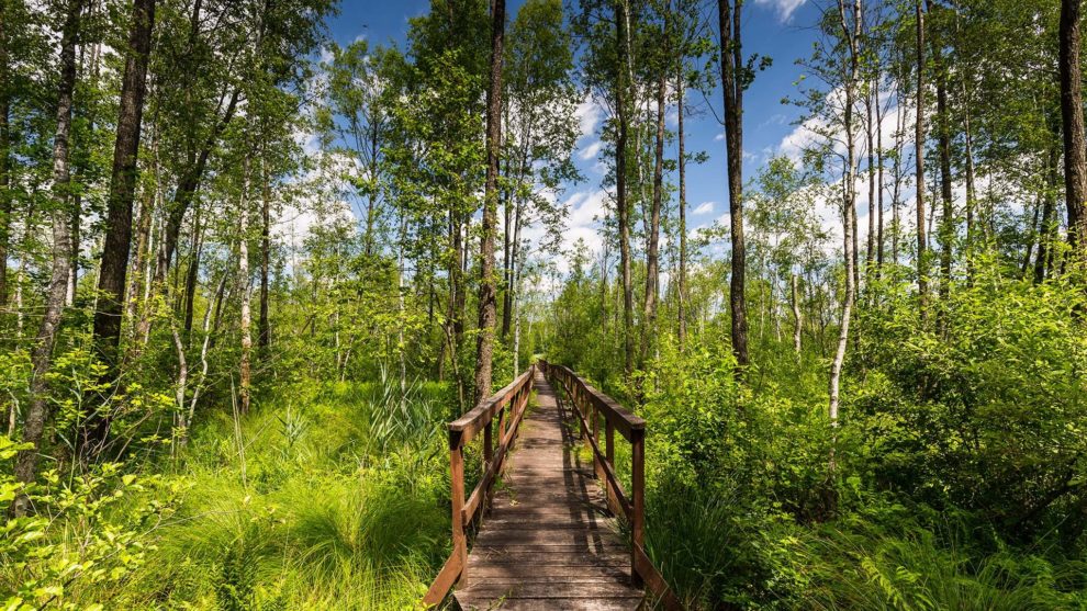 Początkowo kładka wiedzie przez mokradła, po czym skręca prostopadle w las. Można z niej podziwiać niezwykłą przyrodę parku: bagna, torfowiska i bujną roślinność, a także liczne śpiewające ptaki. Symbolem tego miejsca jest żuraw. Ten dziewiczy, naturalnie dziki teren, w pewnym sensie chroniony jest przez nieprzeniknioność mokradeł i gęstych zarośli. To istny raj dla wszelkiego rodzaju stworzeń!