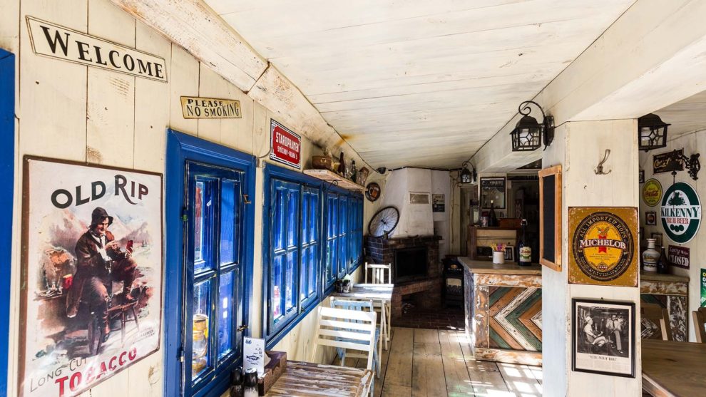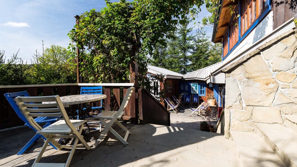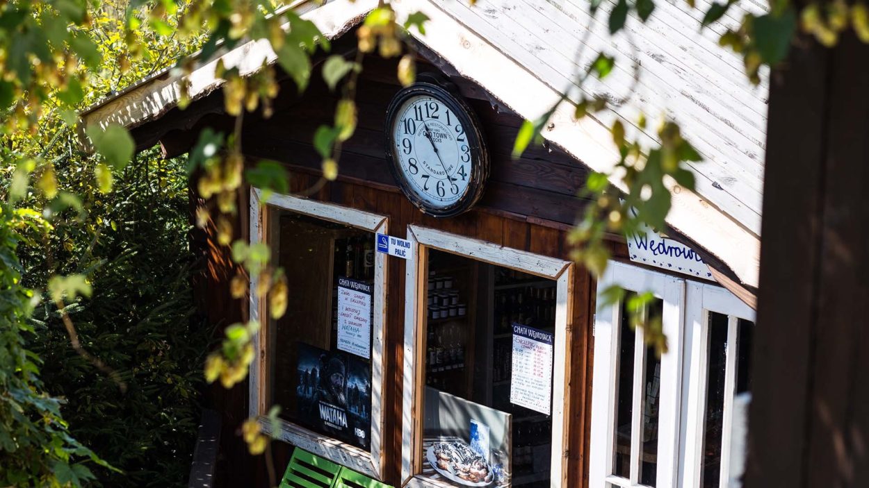Przechodząc z parkingu do chaty, jak za dotknięciem czarodziejskiej różdżki, człowiek trafia do innego świata. Otoczony zielenią taras odcina to miejsce od reszty świata. Stylowe wnętrza są przytulne i urządzone z niezwykłym smakiem i harmonią. Wypełniony pięknymi przedmiotami Sklepik Wędrowca pozwoli zabrać kawałek tego świata do domu.