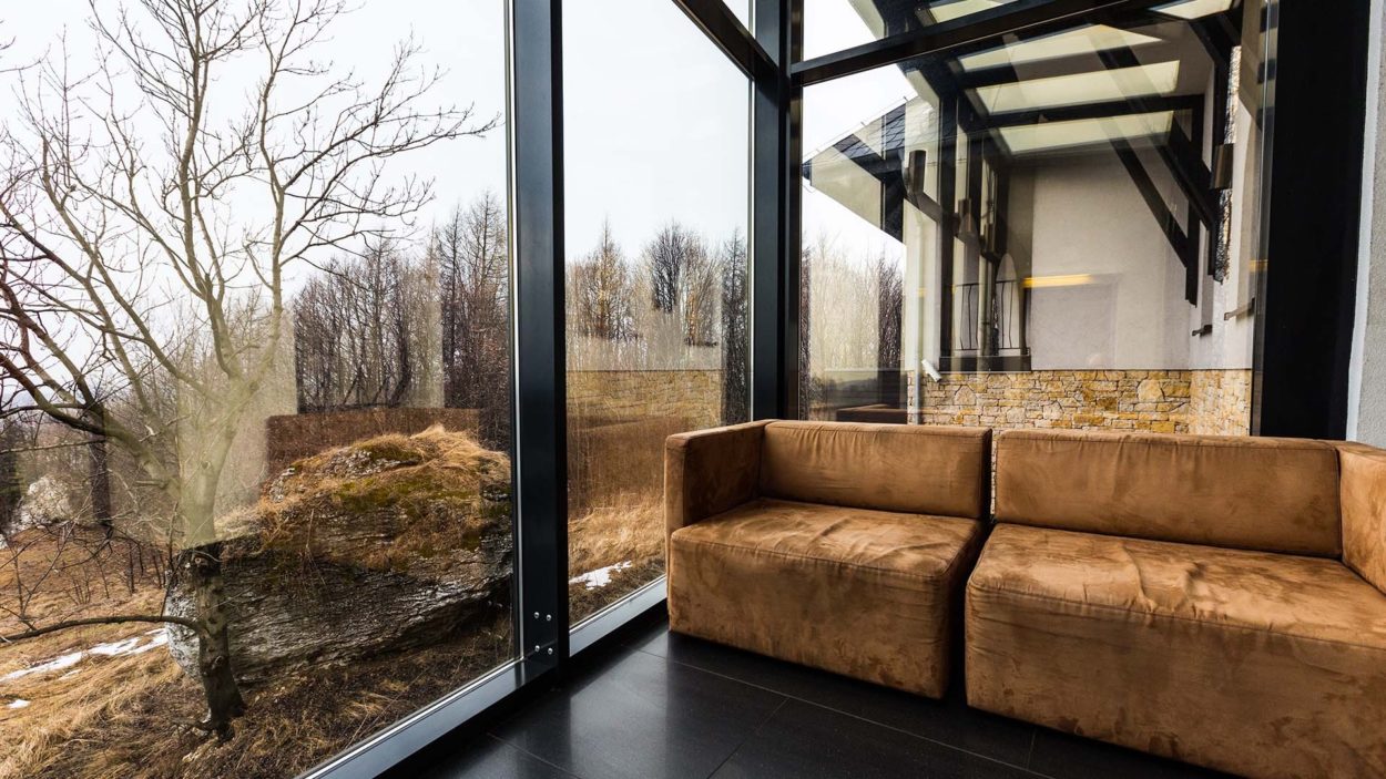 Na horyzoncie widać majestatyczne ruiny zamku Ogrodzieniec w Podzamczu – najwyższe jurajskie wzgórze jest idealnym punktem widokowym. Cel mojej podróży, hotel Poziom 511, znajduje się dokładnie po jego drugiej stronie. Przybywając od strony Skarżyc, nigdy nie pomyślałbym, że za wapiennymi ostańcami na szczycie ulokowano jeden z najciekawszych hoteli na Jurze. Ścisła współpraca architektów z konserwatorami była nie lada wyzwaniem. Ukryta pośród skał perła czeka na swoich gości.
