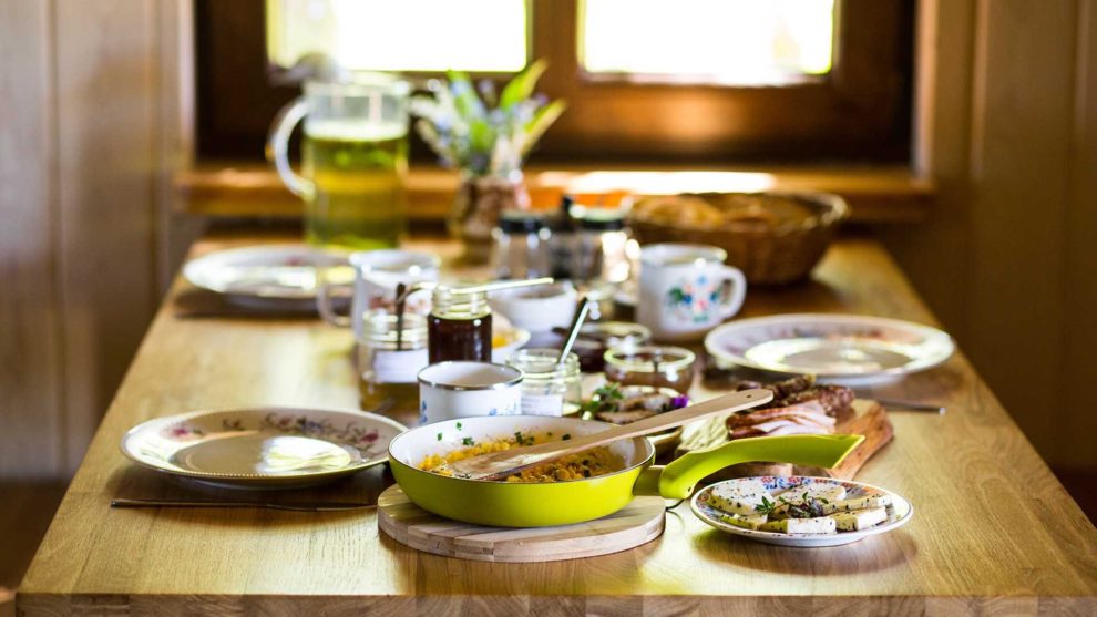 Państwo Latos stworzyli Latosowo i włożyli w nie ogrom pracy i serca. Widać to na każdym kroku. Na gości czekają zaciszne pokoje w domu, który przeniesiono tutaj z Podlasia. Jego dolną część zajmują kuchnia i jadalnia, a na górze zmieściły się 4 pomieszczenia. Życie skupia się tu wokół kulinariów, bo pomysłowość Kasi i Bartka nie zna granic. Dzięki nim pierwszy raz w życiu zjadłem taką ilość ziół i odkryłem zupełnie nowe smaki, kosztując pieczonego królika, kawałka koziny czy żurku na dudkach. Weganie i wegetarianie również znajdą tu coś dla siebie, ponieważ Kasia jest mistrzynią kuchni bezmięsnej. Swoje potrawy przyrządza głównie z tego, co rośnie w przydomowym ogródku. Na stół trafiają też pyszne kozie sery, których proces produkcji możecie obserwować od początku do końca na miejscu. Generalnie miłośnicy gotowania i eksperymentowania poczują się tutaj jak w raju. Idąc na obiad, uzbieraliśmy z Bartkiem rosnące na łące składniki do naszej sałatki!