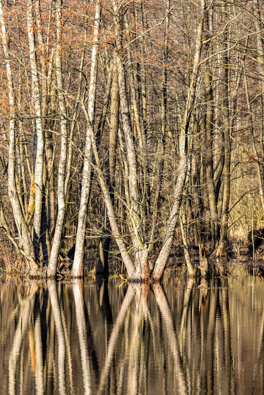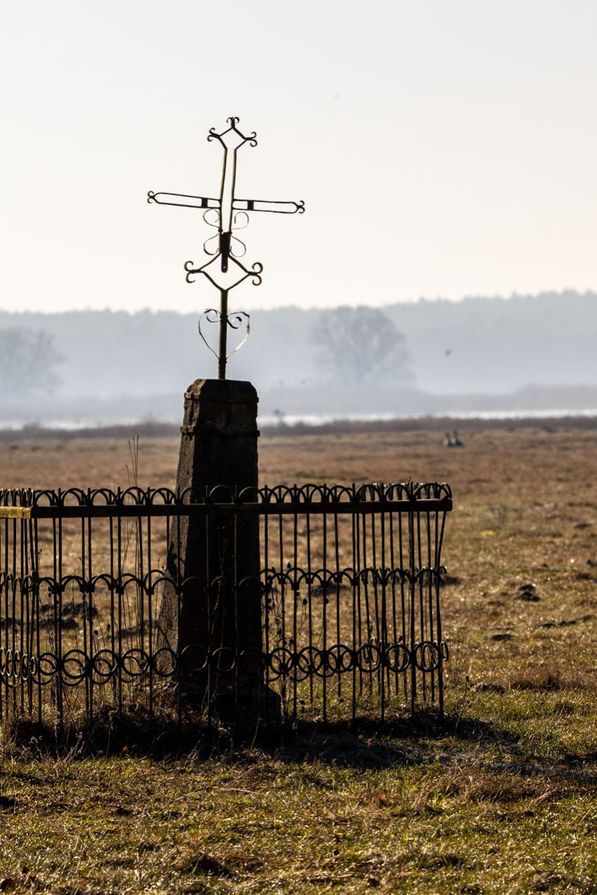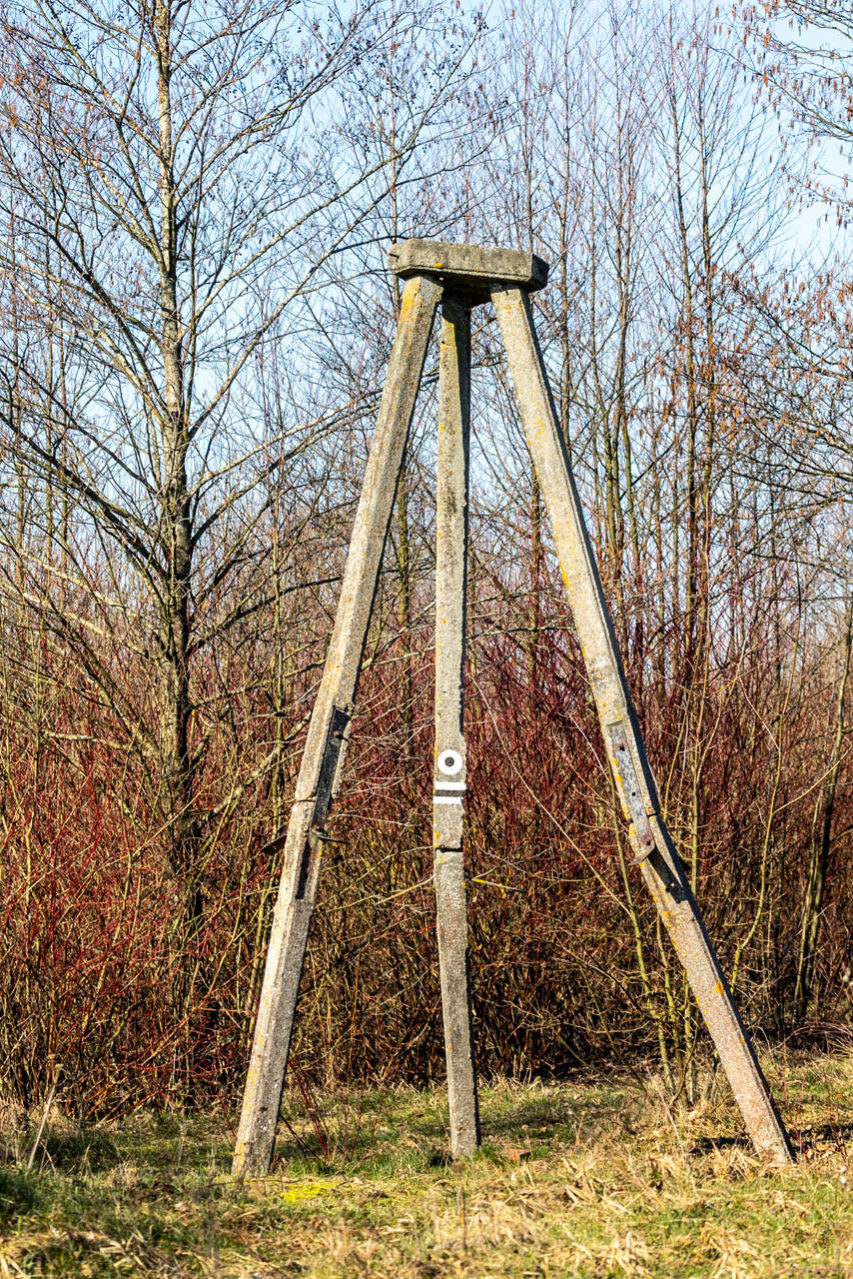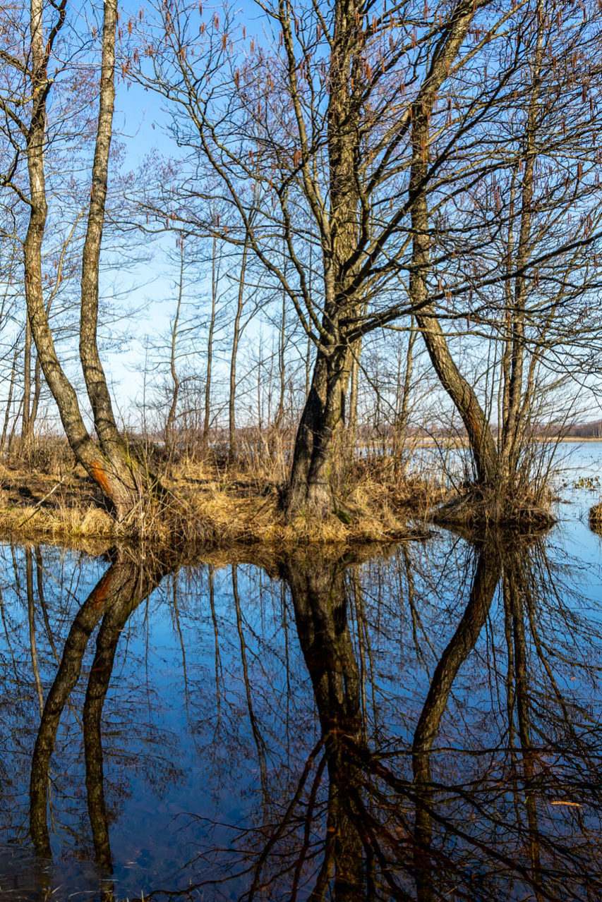 Szlak skręca w prawo i nikłą ścieżką biegnącą przy ścianie lasu prowadzi do celu, którym jest punkt wysokościowy (trianguł). To niespełna 1,4 km szlaku, ale ileż cudów po drodze! Zaskakuje spokój, jakim emanuje to miejsce. Widać, że przestrzeń nad rozlewiskami to miejsce, do którego licznie zagląda dzika zwierzyna. Ziemia jest zryta przez dziki i widoczne są wyraźne tropy łosi. Na niebie szybują gęsi, a w oddali zza zarośli dobiega klangor żurawi.