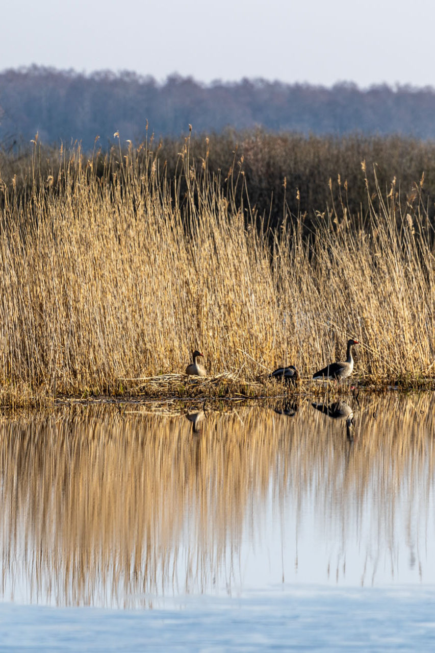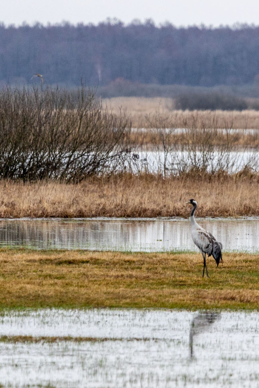 Pierwsze skrzyżowanie za mostem to wąska droga biegnąca w prawo. Można dojechać nią do Zajek i polecam zrobić ten mały skok w bok. Szczególnie po lewej stronie drogi rozciągają się rozlewiska, na których przesiadują liczne ptaki – gęsi i żurawie. Jadąc powoli, można je podziwiać niczym na safari, bo dopóki nie zatrzyma się samochodu i nie zacznie wysiadać, ptaki niemal nic nie robią sobie z obecności pojazdu.