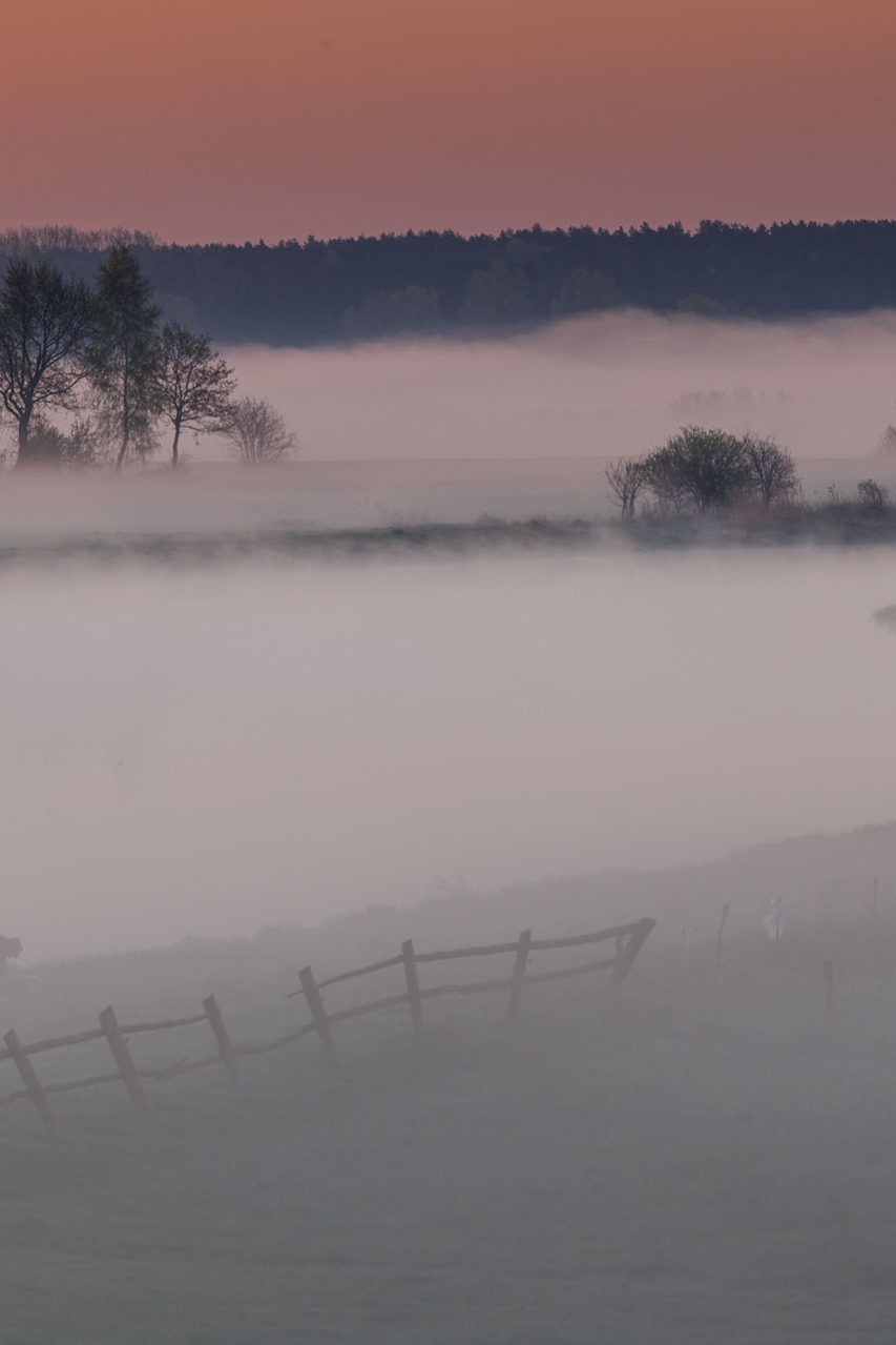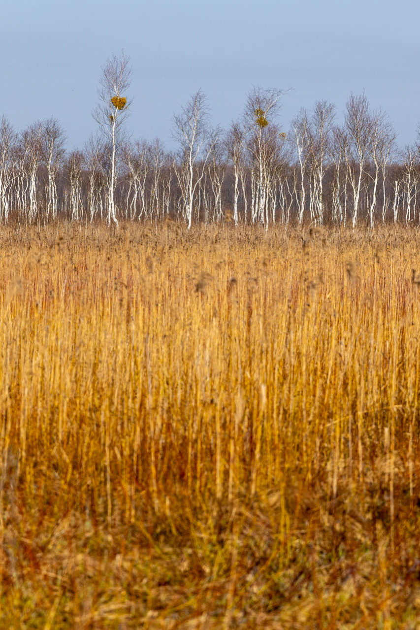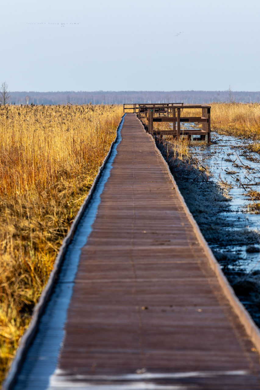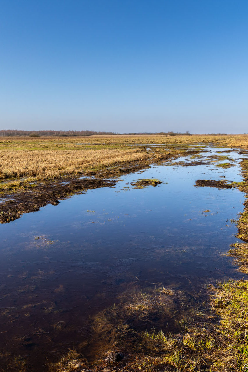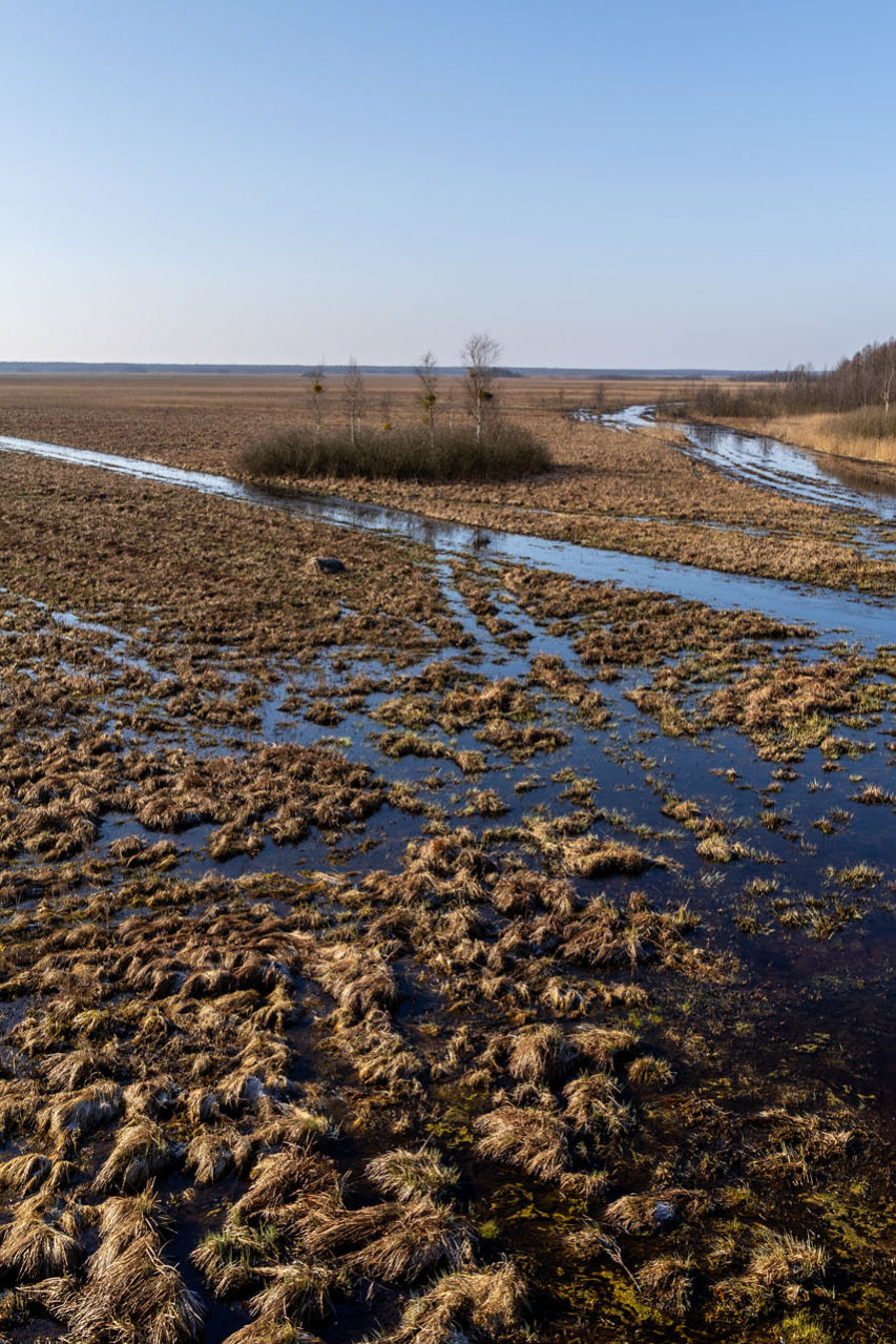 Kalosze zostawiłem w aucie, ale już po ok. 100 m musiałem po nie wrócić. W miejscu, gdzie szlak skręca ostro w prawo, napotkałem na zalaną drogę. Uzbrojony w kalosze zdołałem przejść… jeszcze kolejne 400 m do miejsca, w którym szlak na bagnach skręca ostro w lewo. Tam niemal dosłownie wyrwało mnie z kaloszy. Zatrzymałem się na minutę, żeby zrobić zdjęcia, i kiedy chciałem zrobić kolejny krok, zorientowałem się, że kalosz utknął w bagnie. Wpadłem w lekką panikę, ale po chwili siłowania się z błotem udało mi się wyswobodzić.