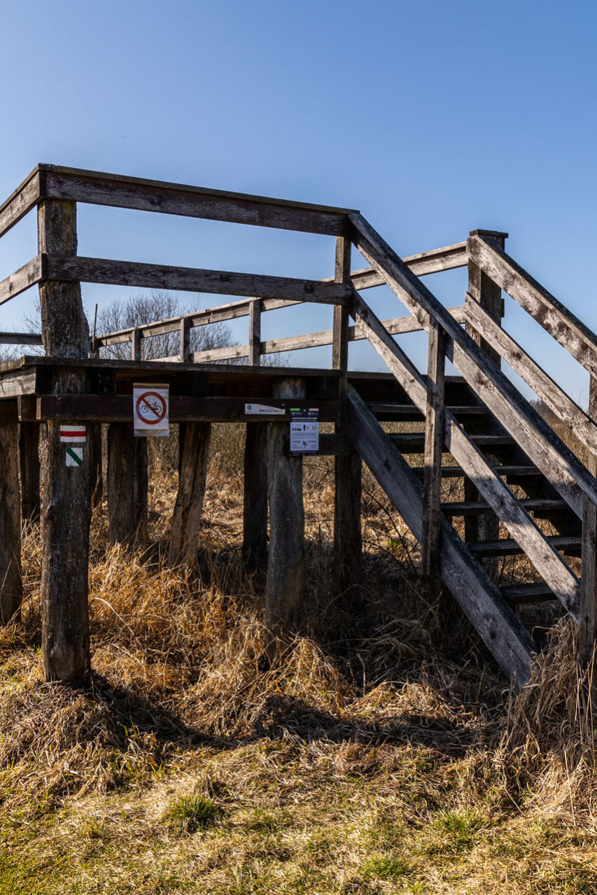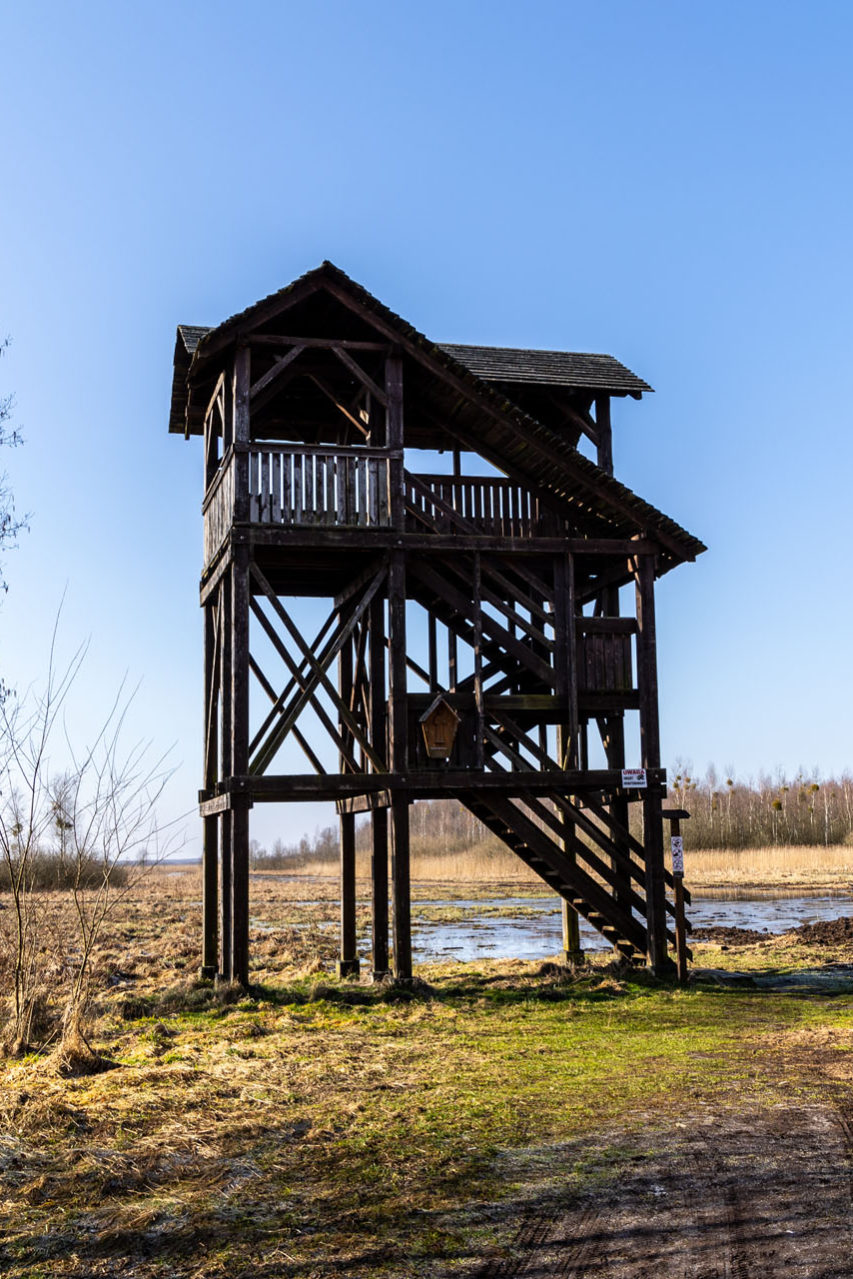 Jadąc kilometr dalej, po lewej stronie mija się wieżę widokową. Warto zrobić w tym miejscu krótki przystanek, żeby rzucić okiem na rozległe Bagno Ławki. Po horyzont nie ma nic, tylko ciągną się porośnięte trzcinami bagna.