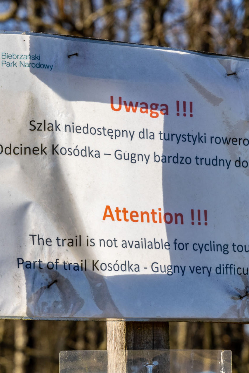 Kolejnym miejscem, w którym warto skręcić z szosy, są Gugny. Po ok. 4 km od parkingu przy Grobli Honczarowskiej stoi drogowskaz do niewielkiej osady. Dojeżdża się do niej leśną drogą i nie ma oznakowanego parkingu. Dotarłem samochodem na skraj zabudowań i dalej czerwonym szlakiem poszedłem pieszo. Na skraju lasu wisi kartka informująca o tym, że szlak na odcinku Gugny – Kosódka jest trudny do przejścia.