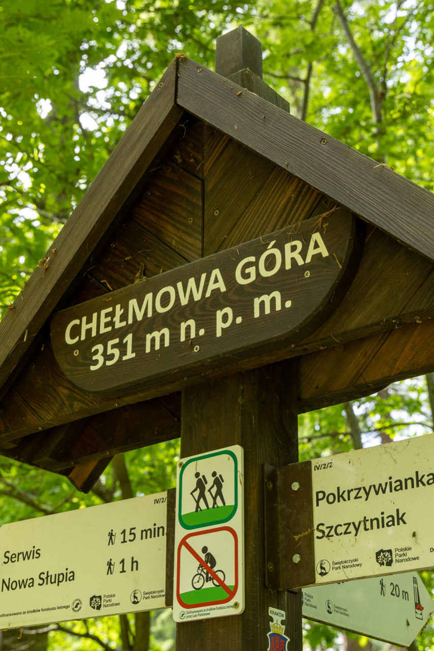 Brak parkingu w pobliżu góry może świadczyć o tym, że nie jest ona zbyt często odwiedzana. To jednak mocno komplikuje sprawę, bo w pobliżu naprawdę nie ma opcji legalnego i bezpiecznego zostawienia auta. Najsensowniejszym wyjściem jest zaparkowanie w centrum Nowej Słupi i przespacerowanie się w stronę Góry Chełmowej. Niestety w obie strony w sumie będzie to ok. 7 km, z których aż 4 km to spacer mało ciekawą drogą asfaltową. Gdybym nie przekroczył bramy lasu, mógłbym powątpiewać w sens tej eskapady. Tu mała dygresja: Wejście na teren Świętokrzyskiego Parku Narodowego jest płatne, na bramie wejściowej znajdują się kody QR, dzięki którym w niespełna minutę można kupić bilet online.