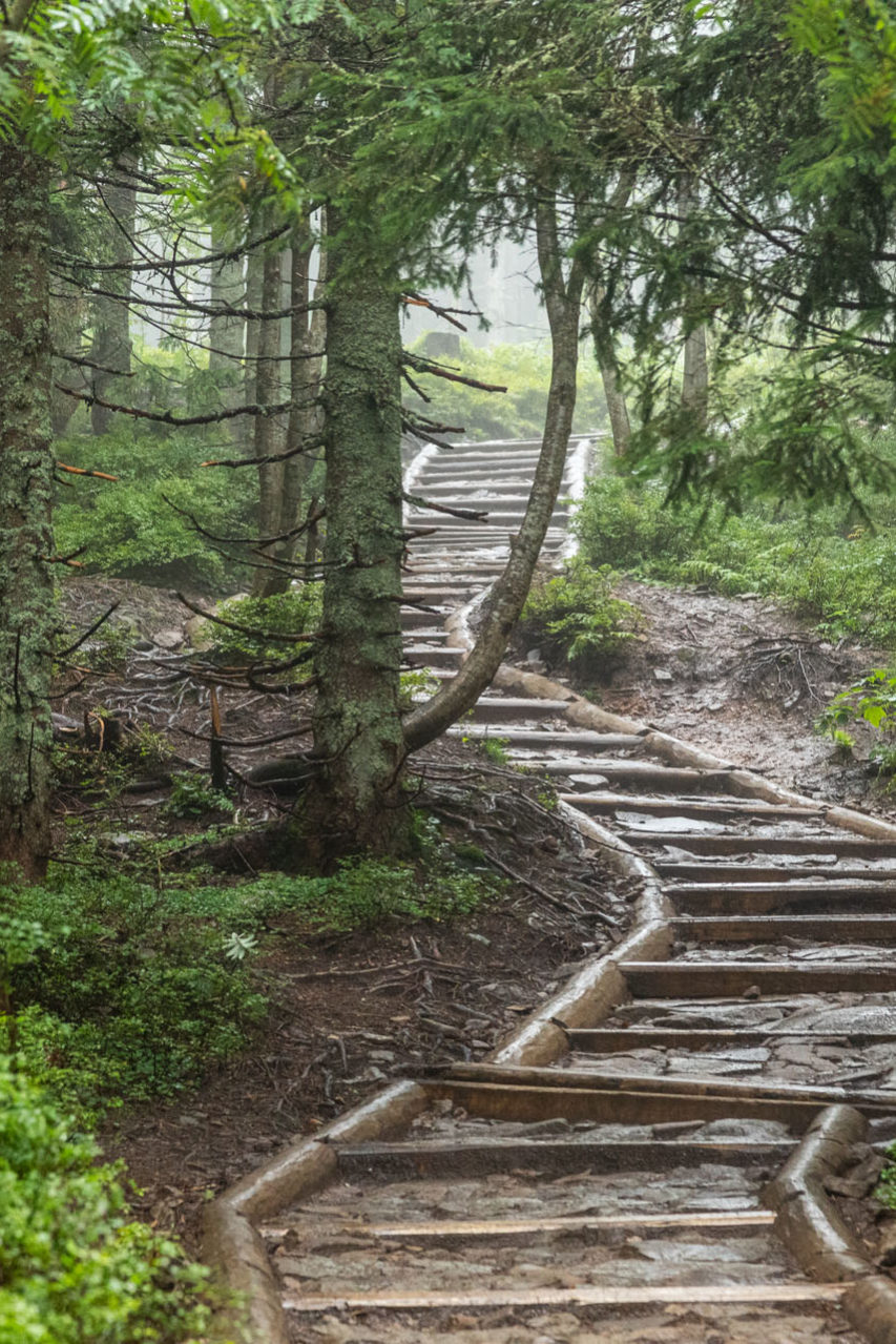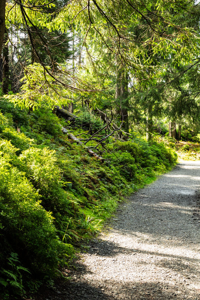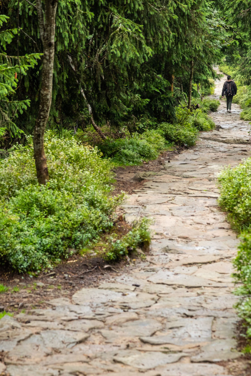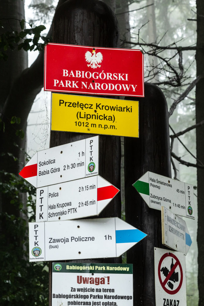 Sieć szlaków oplatających masyw Babiej Góry pozwala stworzyć ciekawą i zarazem przyjemną pętlę. Swój początek ma on na przełęczy Krowiarki i rozpoczyna się przy punkcie kasowym Babiogórskiego Parku Narodowego. Według drogowskazów wejście na szczyt czerwonym szlakiem powinno zająć ok. 2 godz. i 30 min. W rzeczywistości bez większego wysiłku można pokonać go w ok. 2 godz. Pierwszy odcinek od przełęczy na Sokolicę jest największym wyzwaniem. Ścieżka stromo pnie się w górę i ani na chwilę nie daje wytchnienia. Miejscami szlak przechodzi po zabezpieczonych drewnem stopniach. Po ok. 45 min dochodzi się do górnej granicy lasu. Po prawej stronie znajduje się ogrodzony punkt widokowy na Sokolicy. To w czasie wędrówki pierwsza okazja, żeby spojrzeć na góry. Od tego miejsca szlak staje się przyjemniejszy. Nadal biegnie w górę, ale już nie tak stromo.