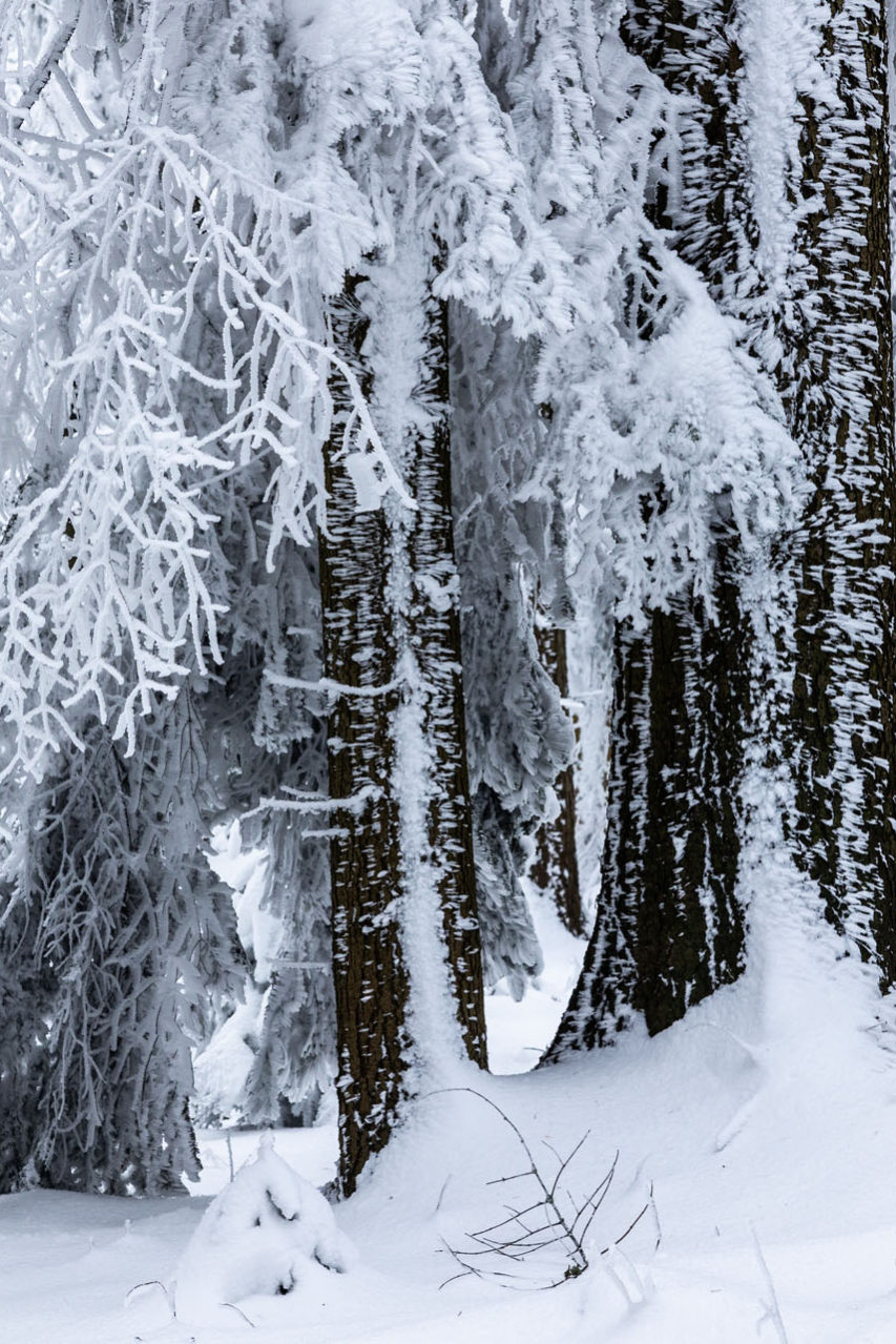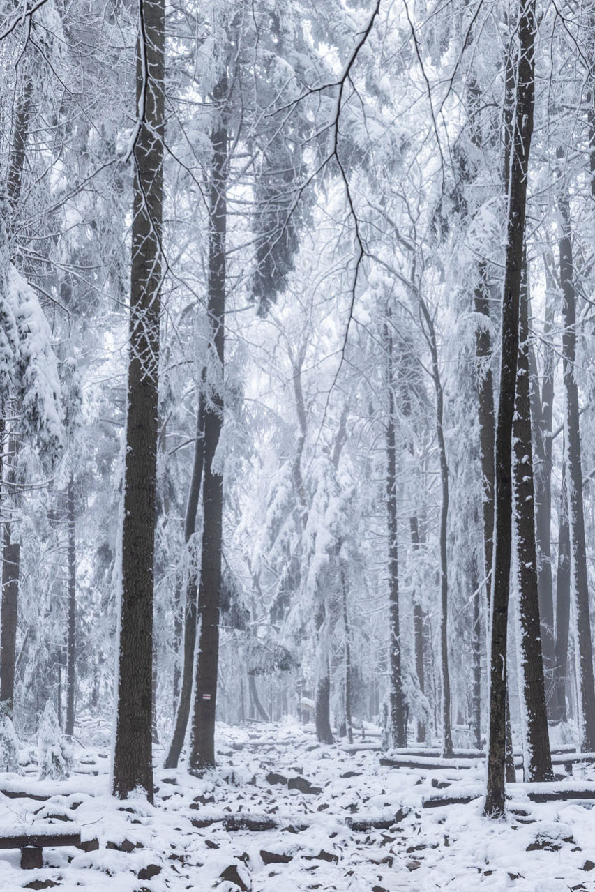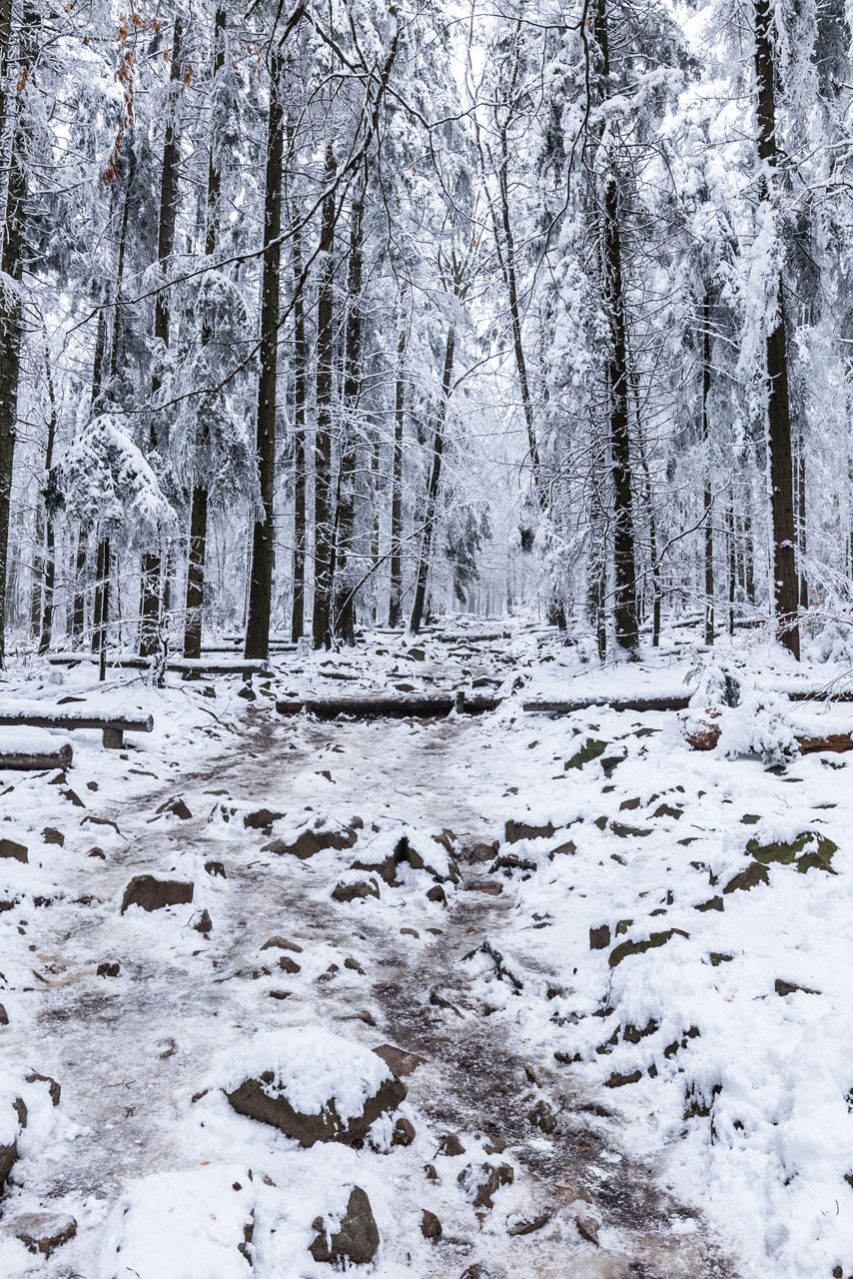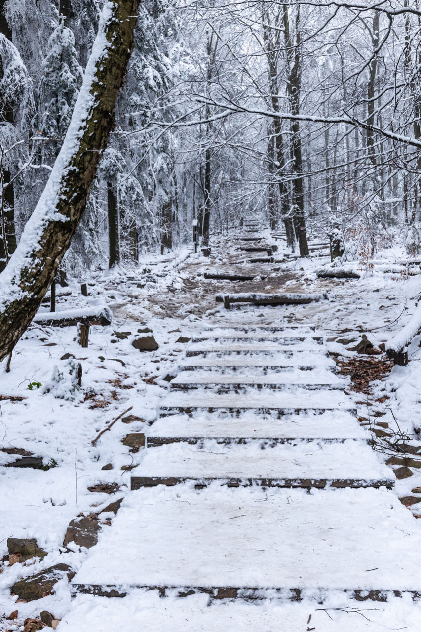 Idąc dalej, rozpoczyna się pierwszy etap podejścia. Częściowo prowadzi on po drewnianej kładce, górskiej ścieżce, a także po specjalnie przygotowanych naturalnych schodach z drewnianymi barierkami. W ten sposób pokonuje się dość stromy odcinek, który wieńczy dojście do Kolana, czyli ostrego zakrętu, gdzie szlak odbija w lewo. Z tego miejsca ścieżka robi się nieco mniej przyjemna i kluczy się między licznymi kamieniami. Na jej bokach znajdują się specjalne ograniczniki z drewnianych belek, które uniemożliwiają rozdeptywanie lasu dookoła. Szlak nie jest stromy, a sygnałem, że szczyt jest już blisko, są dobrze widoczne skałki po lewej stronie. Od tego miejsca podejście nieco się wypłaszacza i prowadzi między drzewami do niewielkiej polany, na której stoi krzyż, drogowskaz, a na jej obrzeżach ustawiono drewniane ławki. Ze szczytu nie roztaczają się rozległe panoramy, w całości jest porośnięty lasem. Stojąc obok krzyża, można spojrzeć w kierunku północnym, ponieważ na schodzącym w dół gołoborzu nie ma drzew.