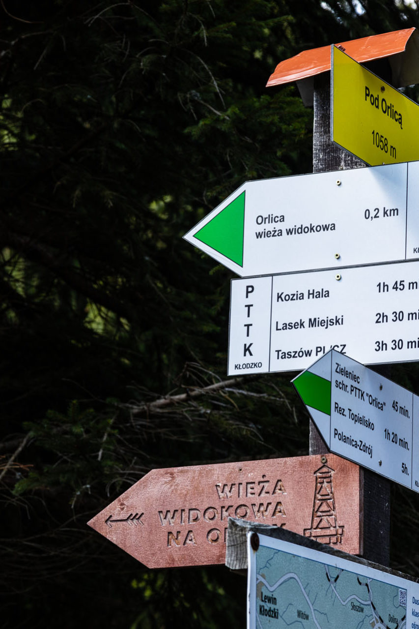 Najkrótszy szlak zielony na Orlicę z polskiej strony prowadzi szeroką leśną drogą z parkingu przy pensjonacie „Przystanek Alaska”. Śmiało można napisać, że miłośnikom gór nie przypadnie ona do gustu, ale za to świetnie nadaje się na przejście z dziecięcym wózkiem spacerowym. Miejscami szlak jest nieco błotnisty, ale generalnie stan drogi jest bardzo dobry. Dopiero gdy dotrze się na grzbiet, szlak nieco bardziej przypomina górską ścieżkę. Po polskiej stronie ustawiona jest wieża widokowa. Szczyt znajduje się po czeskiej stronie. Łatwo go rozpoznać, ponieważ ustawiono tam charakterystyczny pomnik upamiętniający wizyty trzech wspomnianych osobistości. Z wieży widokowej podziwiać można naprawdę bardzo ciekawe panoramy na wszystkie cztery strony świata. Bardzo ciekawie z tej perspektywy wyglądają pobliskie Góry Stołowe. Całe przejście na Orlicę spokojnym tempem zajmuje ok. 2 godzin.