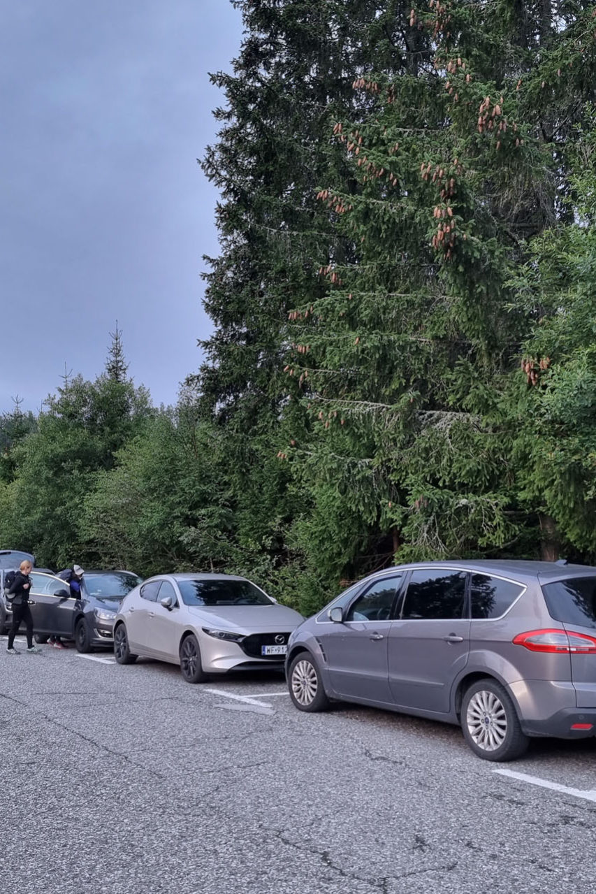 Samochód można zostawić na wyznaczonych do tego miejscach wzdłuż drogi asfaltowej prowadzącej w kierunku Popradzkiego Stawu. W okresie letnim już ok. godz. 6.00 może brakować na nim miejsc. Brzmi to jak ponury żart, ale w tygodniu na początku września, gdy dotarłem na miejsce o godz. 6.05, znalazłem miejsce dopiero w ¾ jego długości. Opłatę można uiścić u obsługi lub w automacie – 10 euro za cały dzień. Wyjeżdżając po godz. 17.00, widziałem, że samochody, ignorując zakaz parkowania, stały wzdłuż całej długości drogi, ale ci z jej końca musieli pokonać dodatkowo prawie 1,5 km asfaltowej drogi, co łącznie w obie strony daje dodatkowe 3 km.
