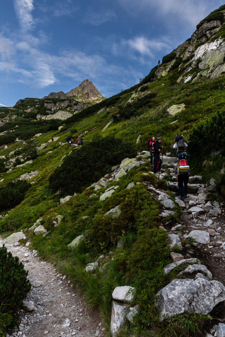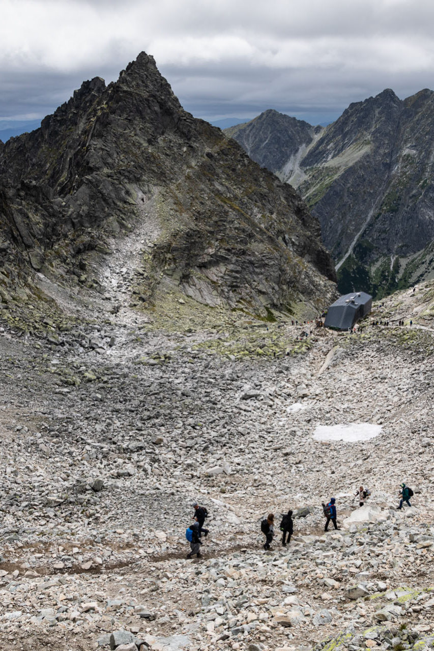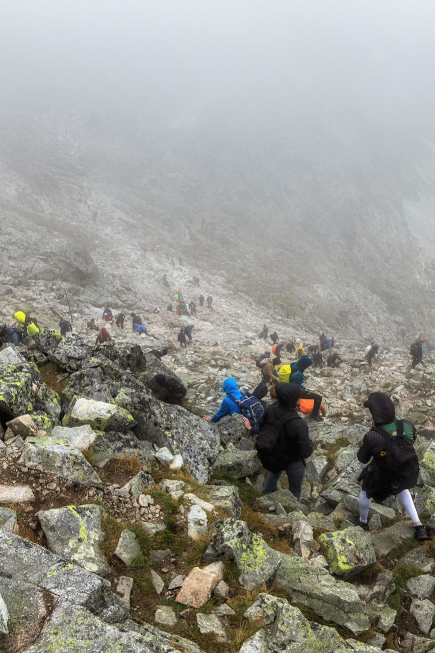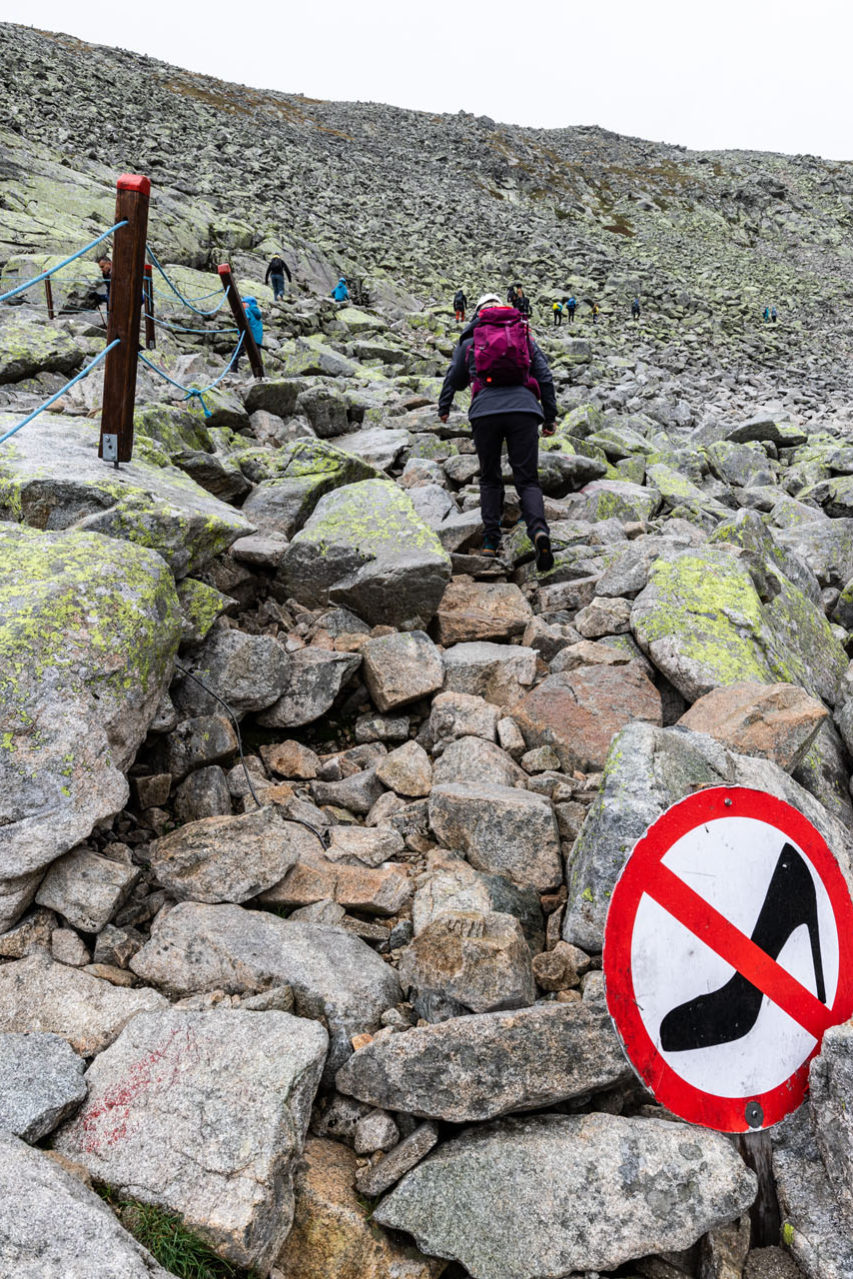 Po przejściu tego odcinka szczyt jest doskonale widoczny. Tu również o pomstę do nieba woła skala zniszczeń na szlaku. Schodzący i podchodzący turyści wybierają sobie własne ścieżki, często niebezpieczne i karkołomne. W tym miejscu się przekonałem, że kolejnym razem obowiązkowo zabiorę w Tatry Wysokie kask. Co chwila ktoś z góry krzyczał, ostrzegając przed spadającymi kamieniami. Sytuacja na tym odcinku jest naprawdę niebezpieczna, bo przychodzi rozluźnienie uwagi związane z bliskością celu.