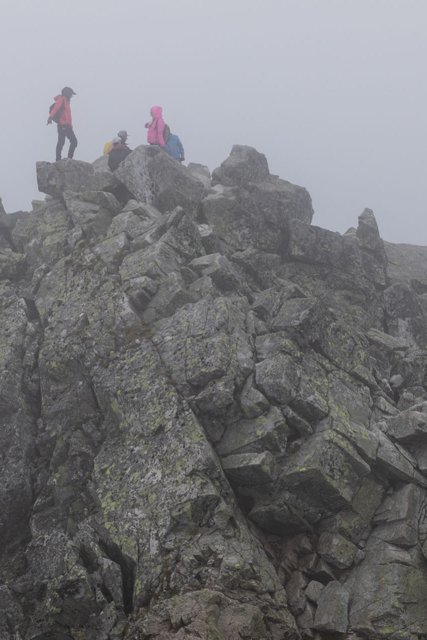 W najwyższym punkcie Polski nie ma nic poza słupkiem granicznym i skalnym gniazdem dookoła niego. Było ono szczelnie oblepione turystami, więc po ekspresowym pamiątkowym zdjęciu zszedłem nieco poniżej kopuły szczytowej po polskiej stronie. Znajdują się tam niewielkie półki skalne, na których można odpocząć, przy okazji podziwiając Morskie Oko w dole i piękną panoramę polskiej części Tatr.