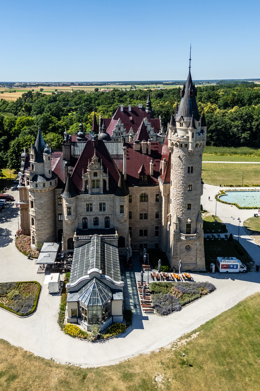 Będąc w Mosznej, nie mogłem pominąć wspomnianego już wcześniej obiektu. No właśnie, ale czy to aby na pewno jest zamek? Spór na ten temat od lat trwa wśród historyków i miłośników architektury. Generalnie jest to pałac, który wygląda jak zamek, dlatego zwyczajowo nazywa się go Zamkiem w Mosznej. Uważam, że cała ta dyskusja jest wtórna, bo przecież liczy się samo miejsce. A to jest niezwykłe! Zamek Moszna to jedna z najbardziej charakterystycznych budowli w Polsce. Od połowy XIX wieku do końca II wojny światowej był on własnością rodziny Tiele-Wincklerów. Po pożarze w 1896 roku podjęto decyzję o jego odbudowie i tak do baroku dołączył neogotyk i neorenesans. Charakterystyczne są jego liczne wieże i wieżyczki. Obecnie w jego wnętrzach działa hotel, restauracja oraz muzeum. Mnie do wizyty skłoniły zabytkowe wnętrza, które urzekają bogactwem detali. Choć obiekt już z zewnątrz robi ogromne wrażenie, to koniecznie polecam zwiedzić go w środku. Jego mury kryją w sobie wiele niesamowitych historii.