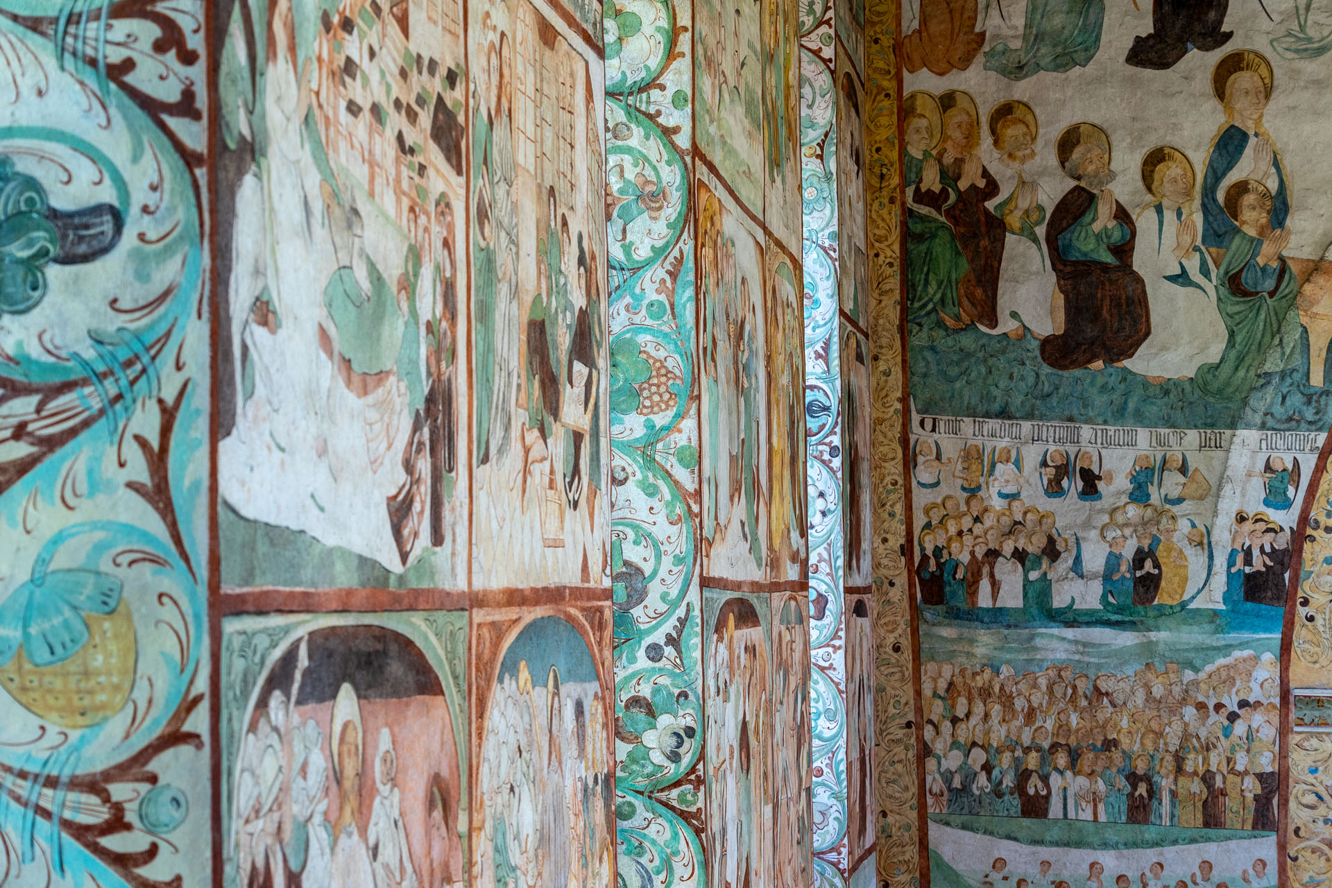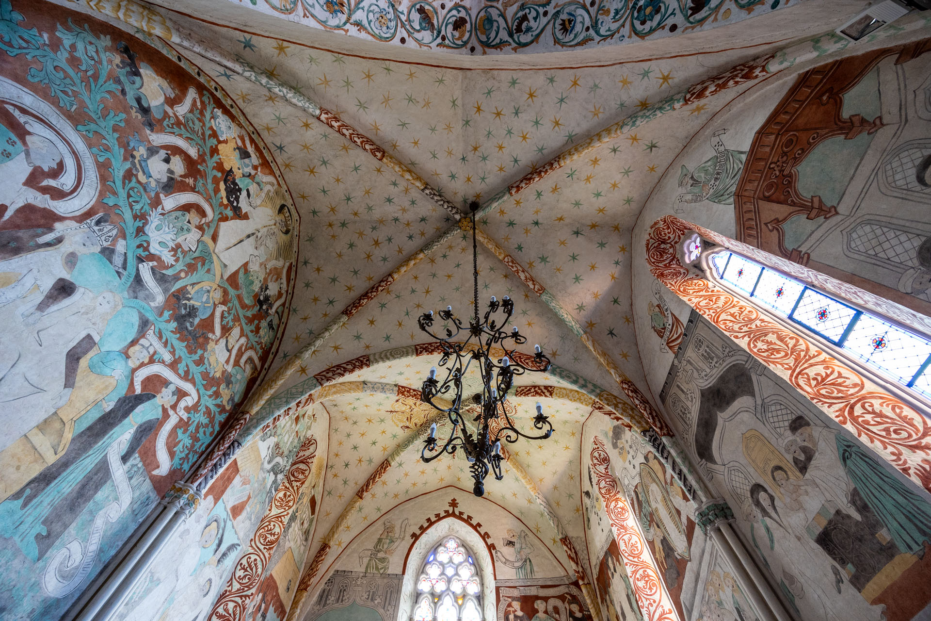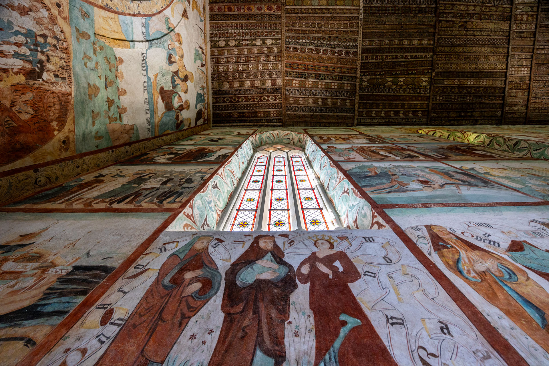 Gotyckie polichromie powstawały etapami, a najstarsze z nich pochodzą z drugiej połowy XIV wieku. W ostatniej fazie, w XVI wieku, motywami roślinnymi, zwierzęcymi, geometrycznymi i heraldycznymi pokryte zostało około 640 desek na stropie.