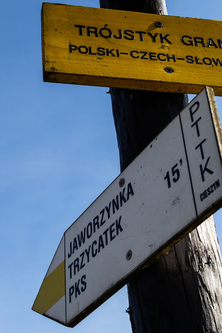 Po tym ciekawym spotkaniu ze sztuką ludową drogą nr 943 najlepiej kierować się aż do ronda w Jaworzynce, które trzeba opuścić zjazdem na trójstyk granic, w kierunku na Lacki. Należy minąć kościół i dojechać do dość dziwnego ronda. Droga na trójstyk biegnie w prawo. Teoretycznie można tam wjechać, ale na końcu nie ma możliwości zaparkowania. Lepiej zostawić samochód na rondzie, a właściwie w jego wnętrzu. Jakkolwiek dziwnie to brzmi, na miejscu nie wygląda to najgorzej i doszedłem do wniosku, że właśnie temu ma ono służyć. Ważne, żeby nie zablokować nikomu wyjazdu ze środka.
