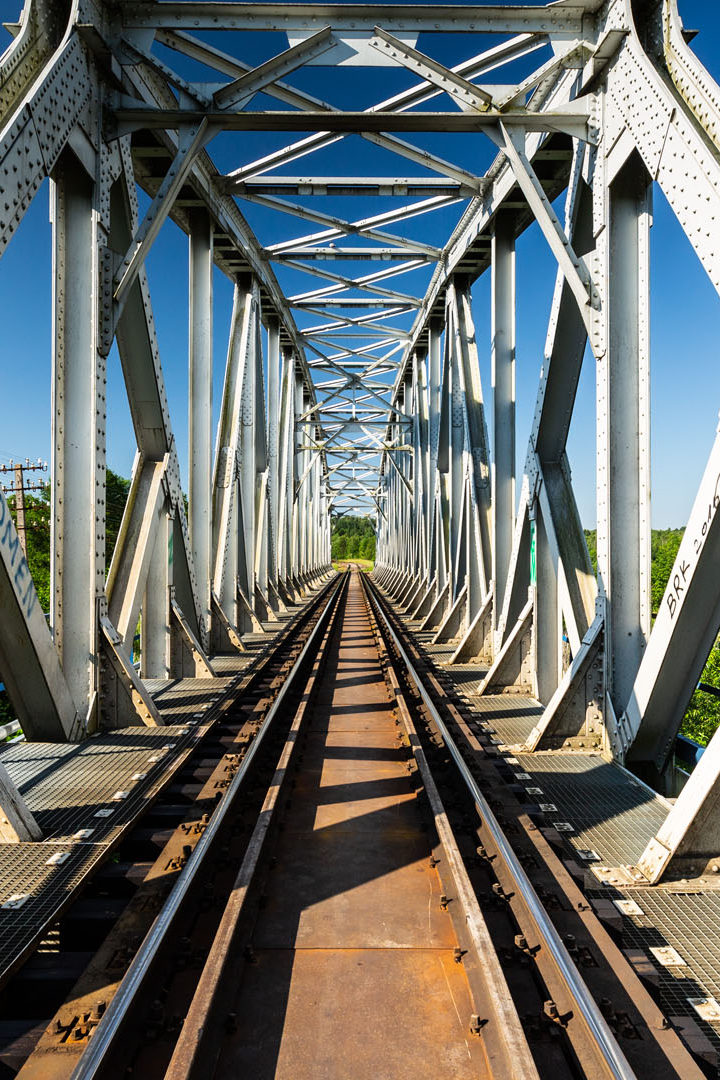Kontynuowałem podróż przez Mogilnice i Jaminy do Sztabina. Na końcu ul. Rybackiej znalazłem urokliwą plażę z pomostem. Biebrza była zauważalnie węższa niż w niższych partiach, a jej nurt zaczął ginąć wśród zarośli. Dookoła zrobiło się zupełnie płasko. Niestety od tego miejsca coraz trudniej o dojście do rzeki. Podążając przeciwnie do jej biegu, pojechałem ze Sztabina przez Krasnoborki do Jastrzębnej Pierwszej. Na drodze za wsią w kierunku Kamiennej Nowej znaleźć można imponujący most kolejowy nad Biebrzą. Przeprawę wybudowano już w 1886 r. Została zniszczona w czasie II wojny światowej i most odbudowano dopiero w 1957 r. Dzisiaj przebiega tędy linia kolejowa łącząca Białystok z Suwałkami.
