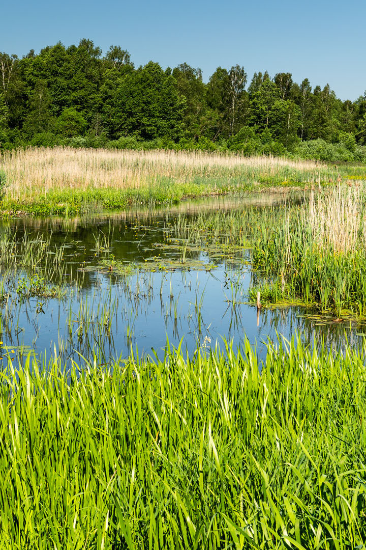 Jak odnaleźć ujście Biebrzy do Narwi? Według map Google jest to proste. Przekonałem się jednak, że to nie do końca prawda – trzeba troszeczkę pokluczyć, żeby dotrzeć do właściwego miejsca. Przypuszczam też, że wczesną wiosną przy wyższym stanie wody dojście do celu może być niemożliwe. Nawet w trakcie suszy przydały mi się kalosze. Żeby trafić do ujścia, trzeba z Wizny udać się w kierunku wsi Ruś drogą wzdłuż Narwi. W pewnym momencie po lewej stronie zobaczymy ostatnie gospodarstwo, a po prawej stronie opadającą lekko w dół łąkę. To właśnie przez nią przeszedłem nad brzeg Narwi i po krótkim spacerze dotarłem do punktu, gdzie łączy się ona z Biebrzą. Spędziłem tam dłuższą chwilę, delektując się widokami i śpiewem ptaków.