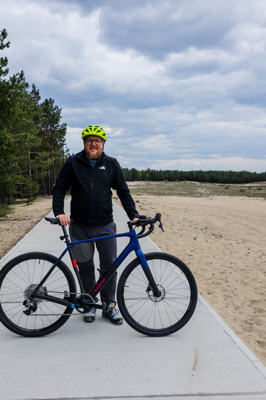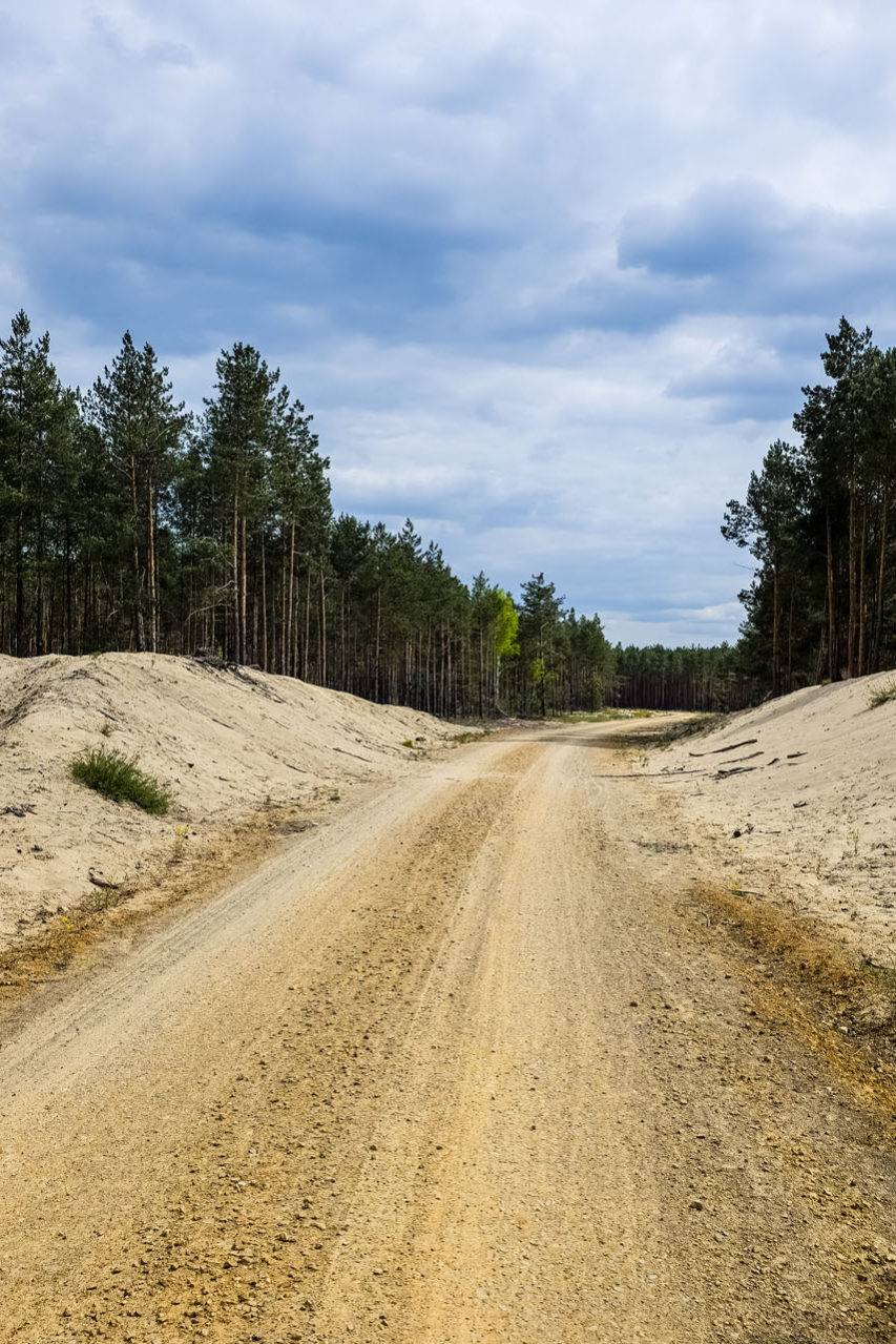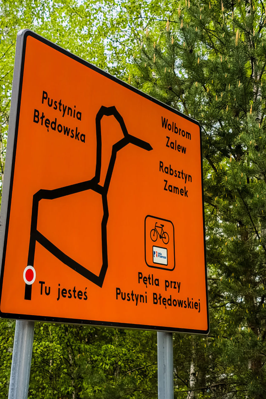 Co więcej, żeby wykonać sensowną pętlę, w pewnym momencie musiałem opuścić oznakowany szlak rowerowy i bazując na mapie, jechać leśną drogą do miejsca przecięcia z innym szlakiem rowerowym niż ten, którym jechałem wcześniej. Dla mnie to nie problem, ale przypuszczam, że mniej doświadczeni turyści mogą mieć w tym miejscu problem, zwłaszcza jeśli nie będą mieli pod ręką cyfrowej mapy w telefonie z lokalizacją GPS. Niby jest to wyraźnie widoczne, bo to pierwsza szeroka droga w lewo po opuszczeniu pustyni, ale uczulam, żeby tego miejsca nie przegapić.