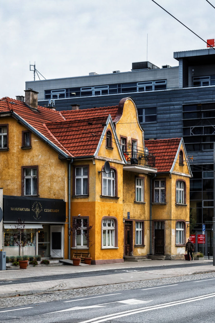 Stoję na skrzyżowaniu ulic 10 Lutego i Władysława IV. W zasięgu wzroku mam przegląd architektury z ostatnich 100 lat. Ta mieszanka jednak mnie nie razi. Wręcz przeciwnie, zaczynam widzieć w niej coś fascynującego. Widzę blok z wielkiej płyty. Nieco dalej galerię handlową z elementami szkła i metalu. Tuż obok moją uwagę przyciąga budynek poczty z białą fasadą i ogromnymi oknami. Idę w kierunku dworca. Przy skrzyżowaniu ulic 10 Lutego i Mściwoja zwracam uwagę na pomarańczową elewację starej willi. W oddali majaczy mi już zaokrąglona bryła modernistycznego budynku Polskich Linii Oceanicznych. Mijając kolejne budowle, bawię się w zgadywankę, czy one są stare, czy wybudowane w starym stylu. W ten sposób dochodzę aż do dworca. Stacja PKP Gdynia Główna w świetle wystawy w Muzeum Emigracji to bardzo ważne miejsce na mapie miasta. W stronę zatoki wracam ulicą Starowiejską, która biegnie równolegle do ulicy 10 Lutego. Ma jednak inny klimat. Jest węższa i zabudowana ściśle szpalerami budynków. Tylko pojawiające się co jakiś czas skrzyżowania dają lekki oddech i poczucie przestrzeni. Przed sobą widzę Sea Towers. „Morskie wieże” oddano do użytku w 2009 r. Wyższa mierzy 141,6 m, a niższa 91 m. Wśród dość niskiej zabudowy Śródmieścia zdają się jeszcze wyższe.