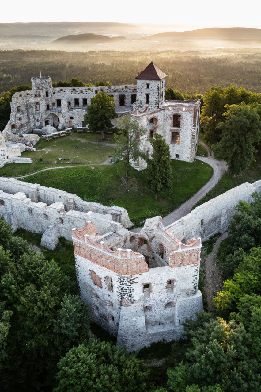 Na szczycie wygasłego wulkanu znajdują się pozostałości po średniowiecznym zamku Tenczyn. Podróżujący autostradą A4 na trasie Katowice – Kraków mogą bez problemu dostrzec jego sylwetkę. Historia zamku ma początek około roku 1308. Był on włączony do szlaku Orlich Gniazd, ciągu granicznych warowni z czasów Kazimierza Wielkiego. Pierwotnie drewniany, został przebudowany około 1319 r. prawdopodobnie przez Nawoja z Morawicy, kasztelana krakowskiego. Choć zamkowa Wieża Nawojowa wzięła swoją nazwę od ojca, to tak naprawdę odpowiedzialny za budowę murowanej warowni był jego syn, Andrzej, wojewoda krakowski i sandomierski. To on jako pierwszy przyjął nazwisko Tęczyński, od którego pochodzi nazwa zamku. Rozrastająca się warownia gościła w swoich progach wiele znakomitych postaci. Rok spędził tu Jan Długosz, często pojawiał się Mikołaj Rej czy Jan Kochanowski. Do połowy XVI w. budowla pozostawała w stylu gotyckim, a w jej sąsiedztwie dobudowano folwark, łaźnię, browar i dom praczek. Po 1570 r. zamek został gruntownie przebudowany przez syna Andrzeja – Jana Tęczyńskiego. Trzyskrzydłową konstrukcję ozdobiły renesansowe attyki, gzymsy i krużganki. Trwająca wiele lat rozbudowa wzmocniła także system obronny. Powstały basteje po dwóch stronach i mur dookoła podgrodzia. W otoczeniu pojawiły się ogrody i winnice. Na początku XVII w. wyremontowano kaplicę. W 1655 r. zamek został zajęty przez Szwedów, którzy rok później go spalili. Choć po potopie szwedzkim został odbudowany, to był zamieszkały tylko w części. W połowie XVIII w. od uderzenia pioruna wybuch pożar, który zapoczątkował proces całkowitego upadku warowni. W 1816 r. zamek trafił w ręce rodu Potockich herbu Pilawa i pozostał w ich posiadaniu aż do II wojny światowej. Wiele lat trwał proces jego rewitalizacji i zabezpieczenia. Od 2016 r. ruiny dostępne są dla turystów i ponownie można podziwiać piękno tego podkrakowskiego zamku.