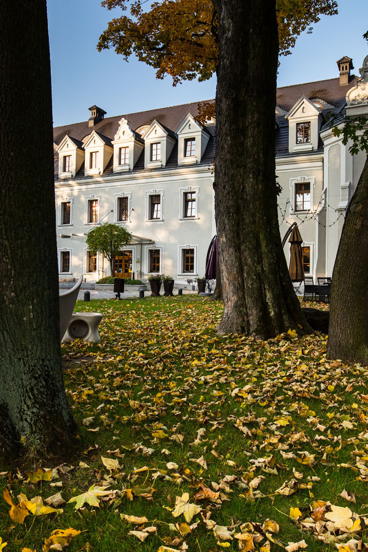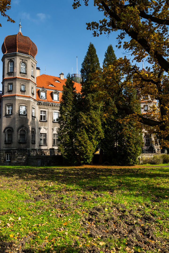 Po spacerze w ogrodzie przyszedł czas na park i pałac. Jest to monumentalna XIX-wieczna budowla, robi ogromne wrażenie i z bliska, i z daleka. W 1829 r. jej centralną część wybudował Bernhard Rosenthal, a w kolejnych latach rozbudował o dwa boczne skrzydła. Po jego śmierci majątek trafił w ręce rodziny Donnersmarck i został przebudowany w stylu eklektycznym. W trakcie wojennej zawieruchy pałac i jego otoczenie nie ucierpiały znacząco. Dzisiaj funkcjonuje tu Technikum Leśne im. Stanisława Morawskiego, a budynek pałacu służy jako internat dla przyszłych leśników.