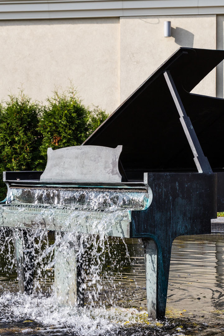 Kiedy już nabrałem siły w leśnym raju, udałem się do Koszęcina. To właśnie tam ma swoją siedzibę światowej klasy Zespół Pieśni i Tańca Śląsk im. Stanisława Hadyny. Siedziba artystów mieści się w pałacu otoczonym jest nastrojowym parkiem. Posiadłość do 1945 r. należała do rodziny Hohenlohe związanej także z Brynkiem. Tuż obok wejścia na dziedziniec pałacowy znajduje się ciekawa fontanna. To fortepian, z którego zamiast muzyki leje się woda. Oplatają go ścieżki w kształcie klucza wiolinowego.