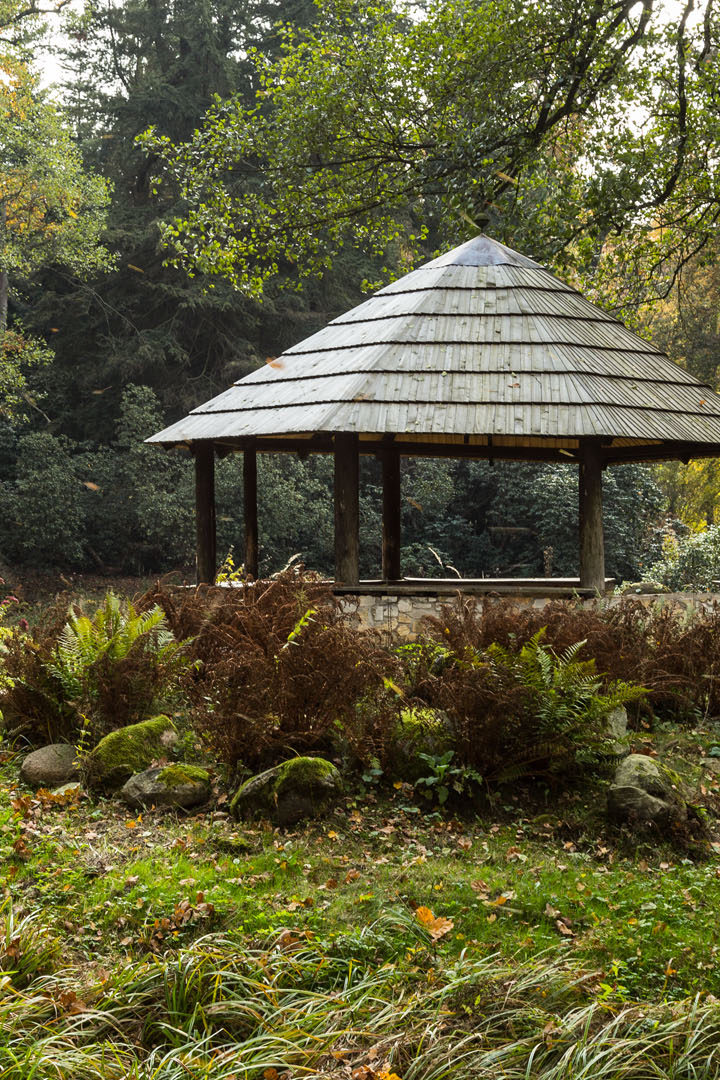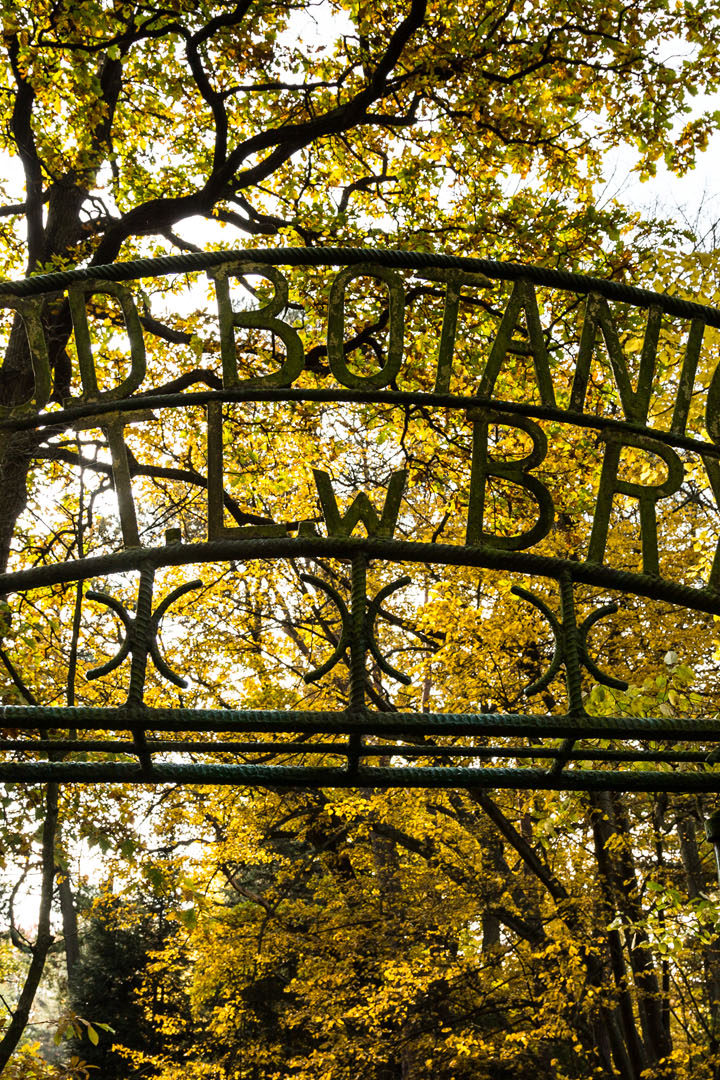 Muszę przyznać, że przy Pałacu w Brynku zabłądziłem. Teraz wiem, że najlepiej jest zaparkować zaraz za wjazdem na teren parku przy budynku technikum leśnego. Stamtąd można wyruszyć na eksplorację okolicy. Warto rozpocząć od ogrodu botanicznego. By go znaleźć, trzeba minąć pałac, przejść w kierunku szkoły podstawowej, a następnie kierować się w głąb lasu. Po chwili oczom ukaże się furtka i ciekawa metaloplastyka nad wejściem, informująca, że wkraczamy do ogrodu botanicznego. Muszę przyznać, że w porównaniu z innymi tego typu obiektami, które widziałem w różnych zakątkach Polski, ten wydaje się zaniedbany. Może to tylko moje wrażenie, a może rzeczywisty brak środków. Wstęp w każdym razie jest bezpłatny. Trafiłem tam w piękny jesienny dzień, dlatego z przyjemnością spacerowałem pozarastanymi alejkami wśród nietypowych okazów drzew i krzewów. Nieco uroku tym chwilom odbierała bliskość ruchliwej drogi nr 11, o czym szczerze uprzedzam.