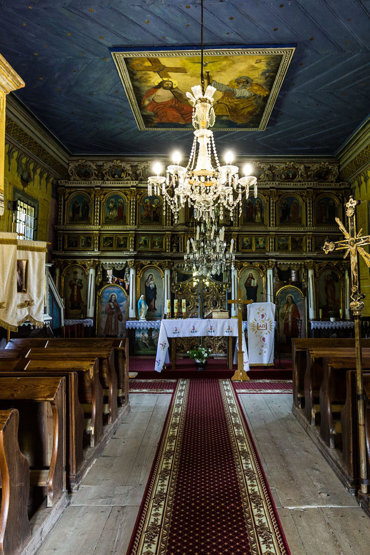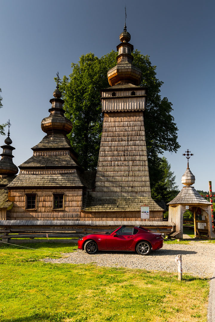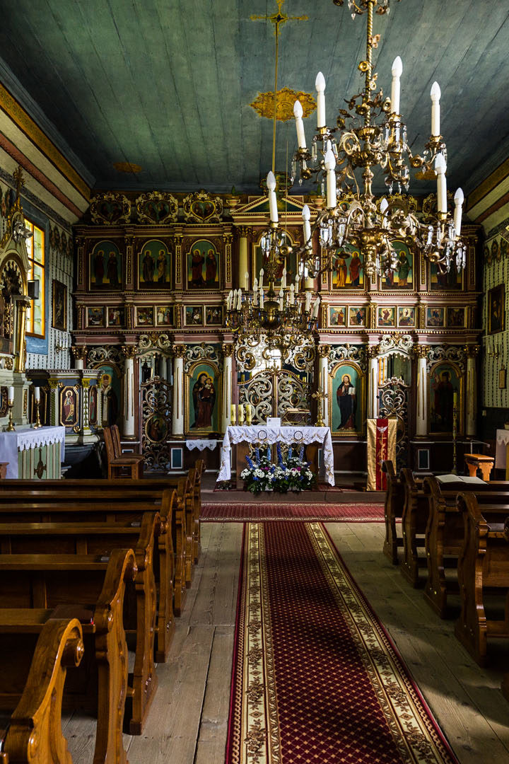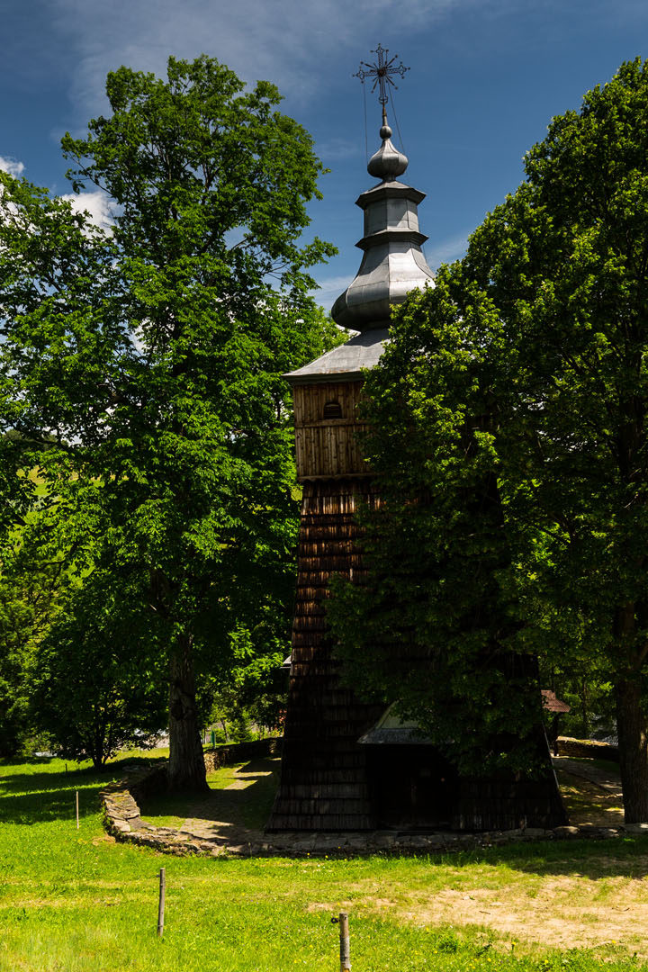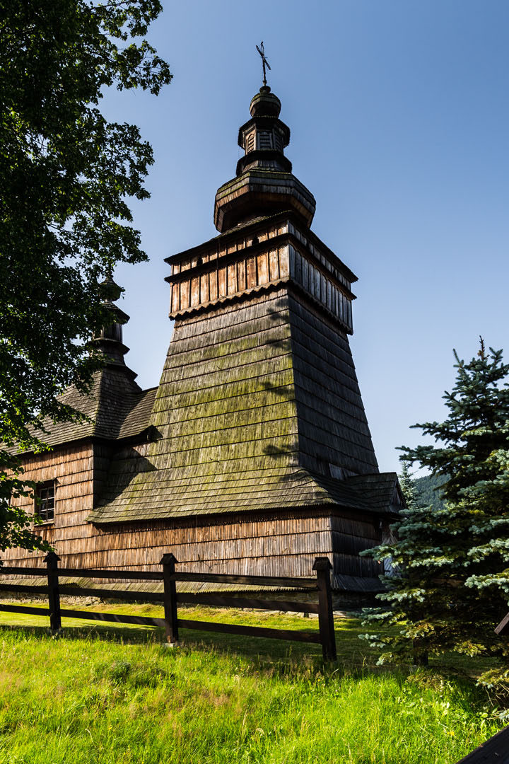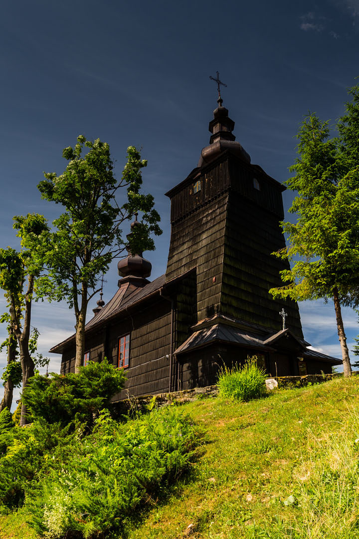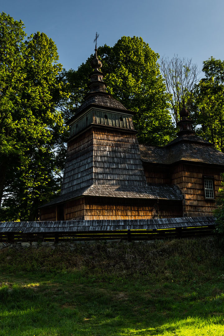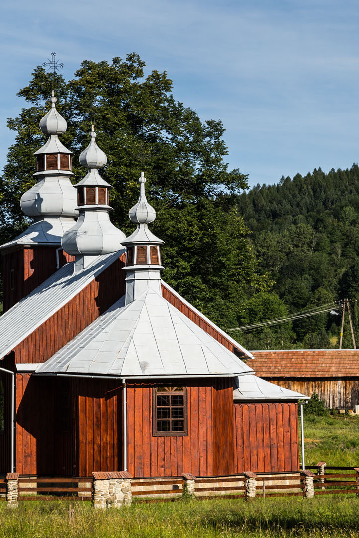 Trasę po Beskidzie Niskim i Pogórzu Ciężkowickim rozpocząłem w Piwnicznej-Zdroju. Udałem się niezwykle malowniczą drogą do Muszyny. Polecam ten przejazd! Jest urzekający. Droga przyklejona jest do rzeki i zarazem granicy państwa. W Muszynie skręciłem w kierunku Leluchowa. Tam jadąc wzdłuż granicy, dotarłem do wsi Dubne. Udało mi się skorzystać z tego, że w sezonie letnim niektóre drewniane kościoły są otwarte i wszedłem do wnętrza cerkwi św. Michała Archanioła (listę świątyń i godziny ich otwarcia można znaleźć tutaj). Takie zwiedzanie ma tę zaletę, że poza pięknymi widokami można usłyszeć ciekawe historie. W dawnych cerkwiach w Dubnem i w Leluchowie wysłuchałem naprawdę wielu ciekawostek i faktów, o których nie miałem pojęcia. Następnie udałem się do Powroźnika, gdzie znajduje się cerkiew św. Jakuba wpisana na listę UNESCO (niestety na zewnątrz był remont). Udałem się jeszcze dalej do Wojkowa i tam zobaczyłem kolejną perłę architektury drewnianej, czyli cerkiew św. św. Kosmy i Damiana.