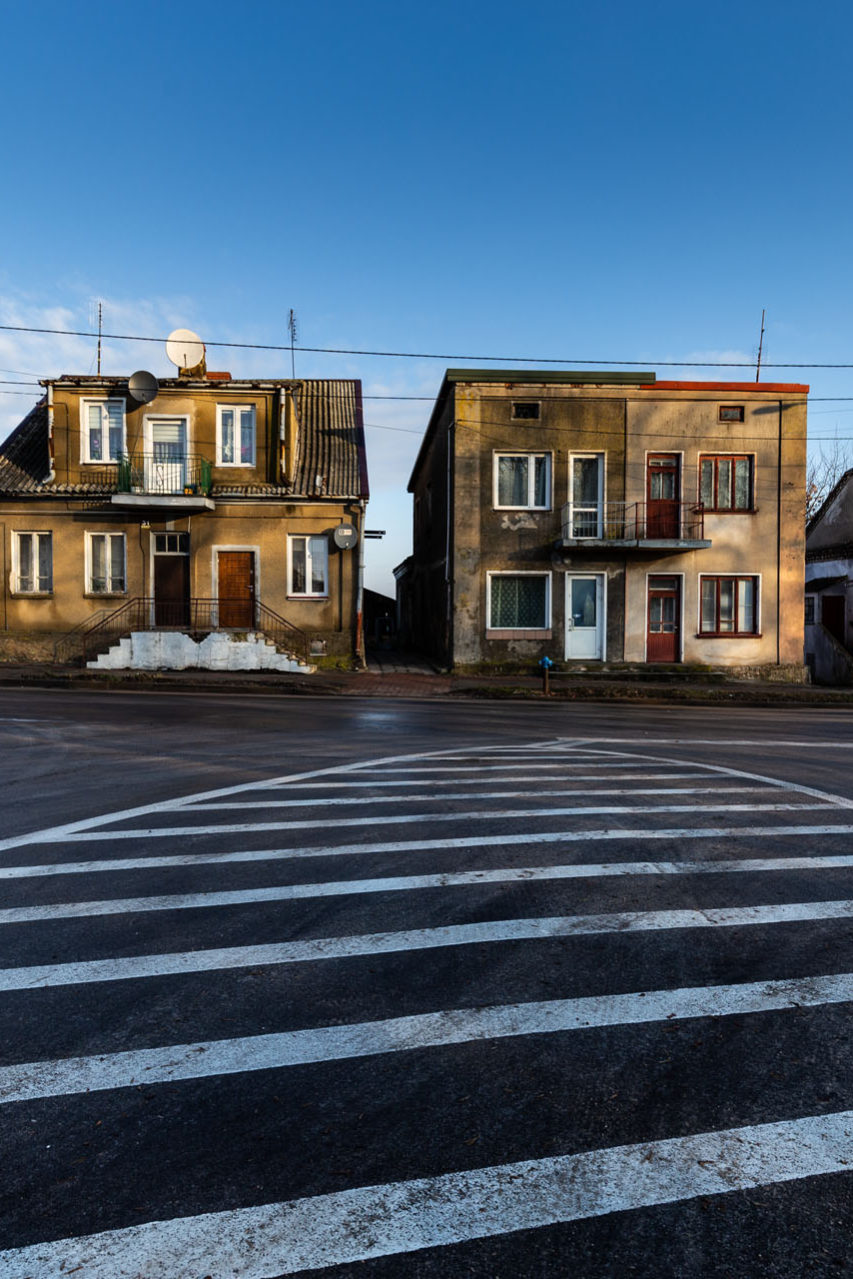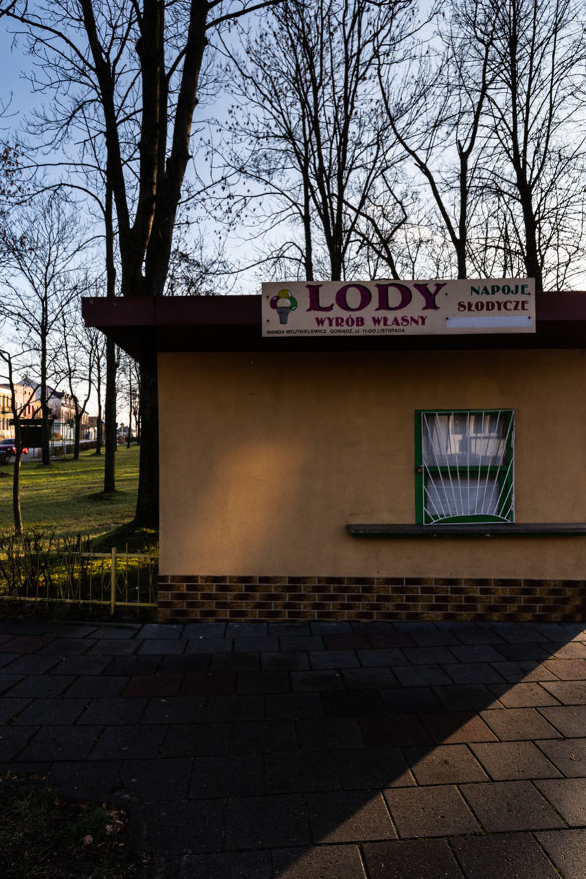 Miasteczko spało. Miałem wrażenie, że i mnie udziela się ta senność. Włóczyłem się z aparatem po śliskich chodnikach. Małomiasteczkowy klimat wciągnął mnie w swój niespieszny rytm. Jedynie sklep „Pysio” przyciągał klientów. Cisza razem z wiatrem przetaczała się po rynku i okolicach. Kilka szyldów mnie rozbawiło, kilka wbiło w zadumę.