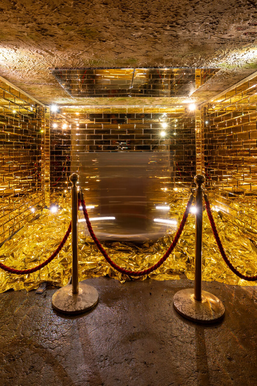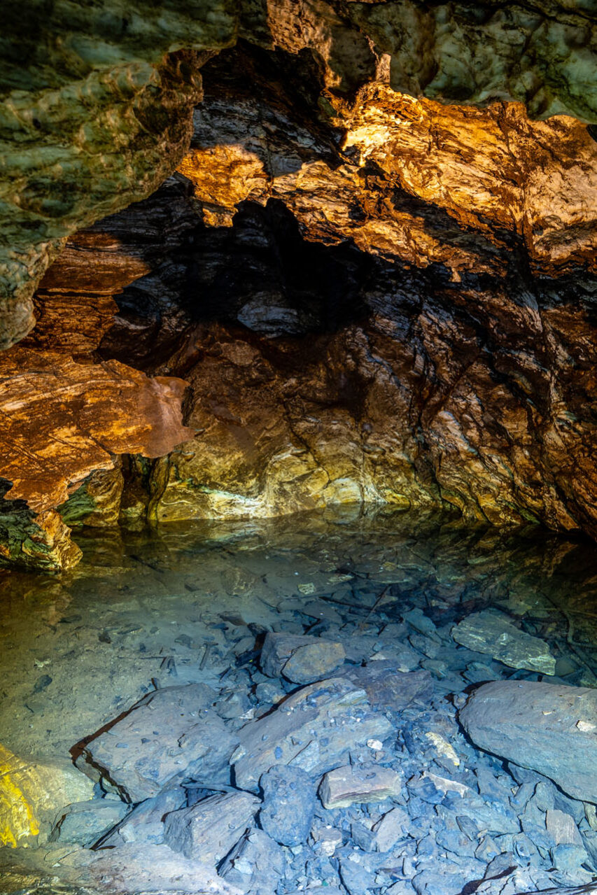 Tym razem z wrażenia zaniemówiłem, podchodząc do jedynego w Polsce podziemnego wodospadu (to mój ulubiony punkt na trasie zwiedzania). Woda z impetem rozbijała się o skałę, a wszystko mieniło się złotem – za sprawą „LED-owej” żyły złota, którą zainstalowano w ścianie. Wyobraźnia ruszyła! Marzenia o złocie stały się żywe! Ależ to musiało być ekscytujące, kiedy górnicy w najróżniejszych zakątkach świata, w nikłym świetle lampki, natrafiali na żyłę złota.