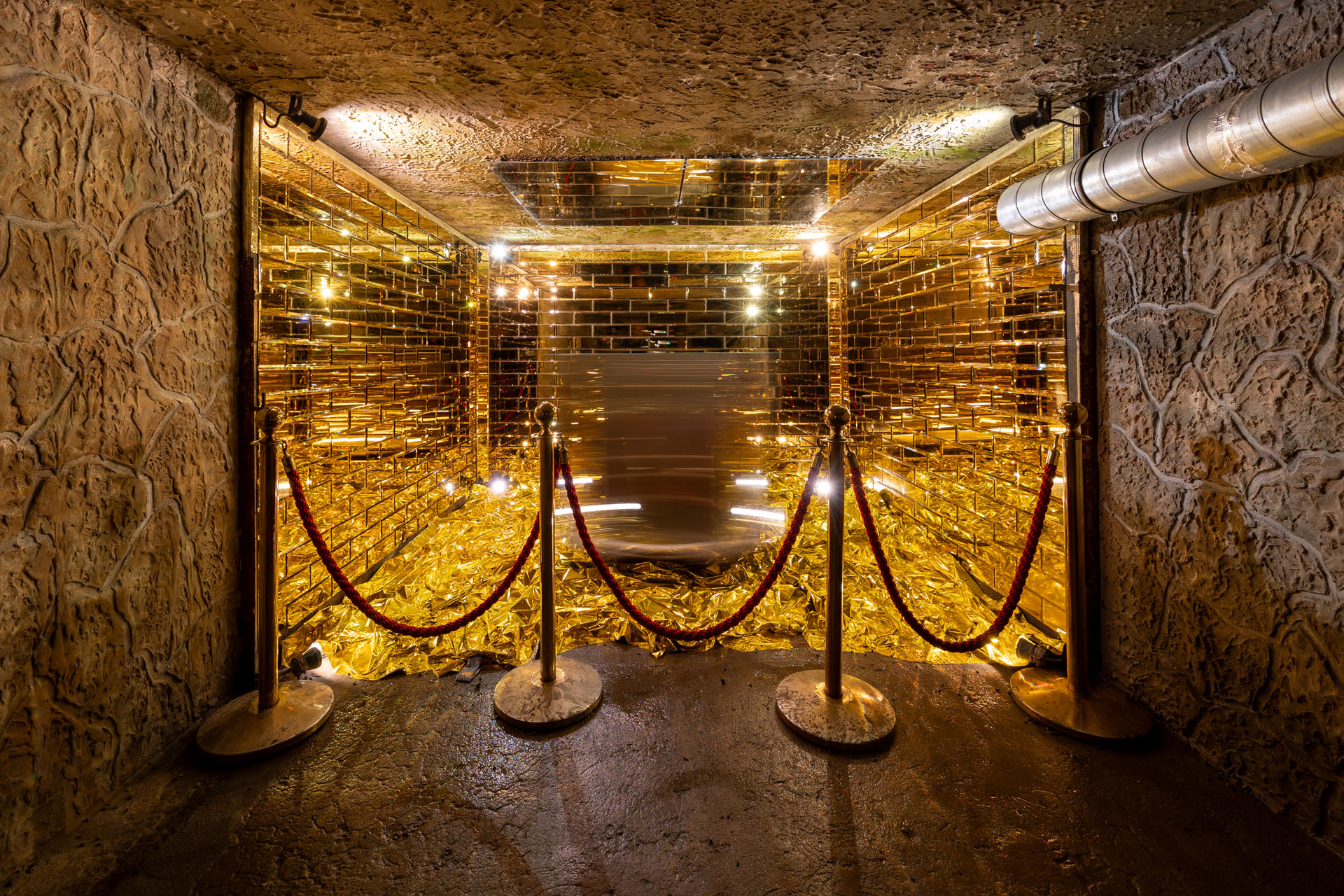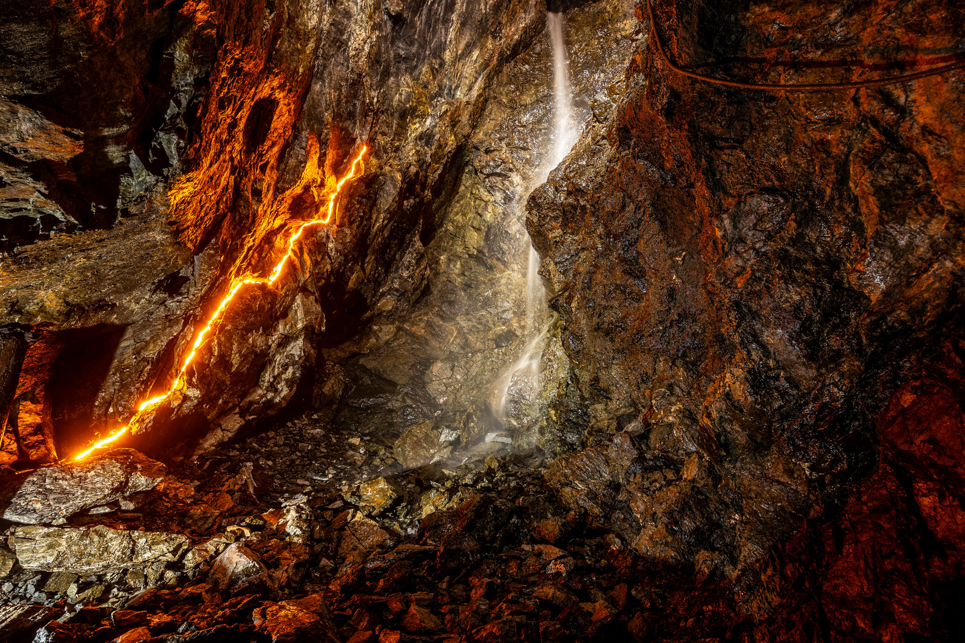 Tym razem z wrażenia zaniemówiłem, podchodząc do jedynego w Polsce podziemnego wodospadu (to mój ulubiony punkt na trasie zwiedzania). Woda z impetem rozbijała się o skałę, a wszystko mieniło się złotem – za sprawą „LED-owej” żyły złota, którą zainstalowano w ścianie. Wyobraźnia ruszyła! Marzenia o złocie stały się żywe! Ależ to musiało być ekscytujące, kiedy górnicy w najróżniejszych zakątkach świata, w nikłym świetle lampki, natrafiali na żyłę złota.
