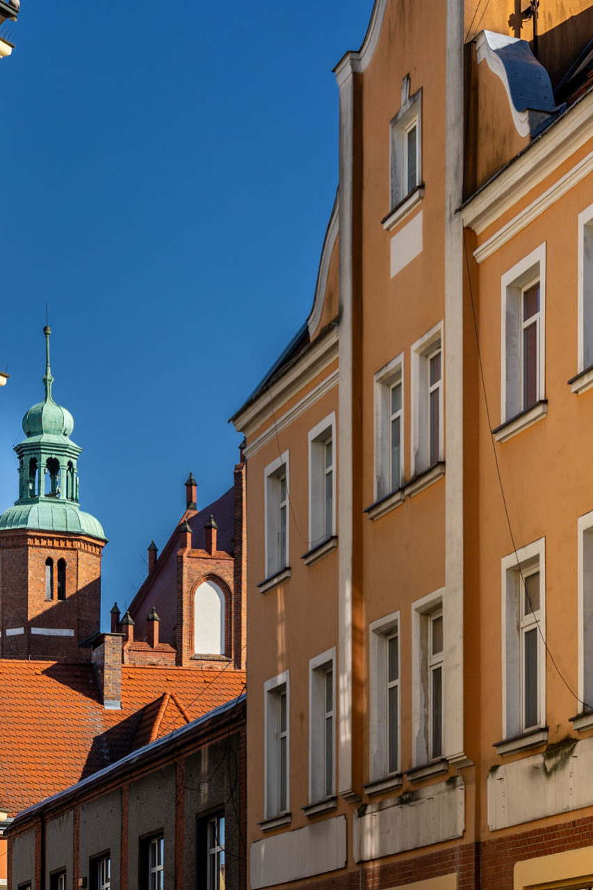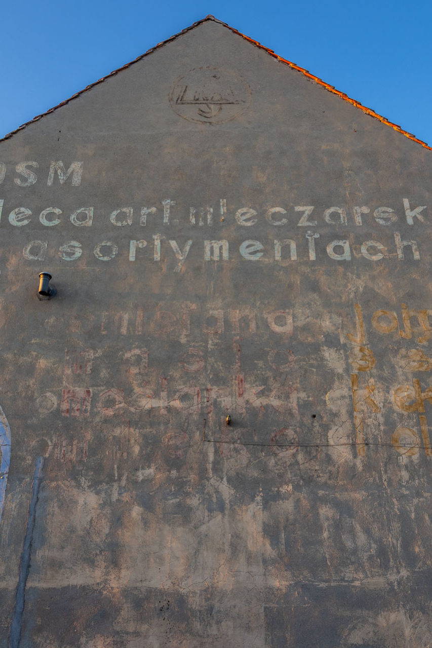Kiedy wyszedłem z kościoła, moją uwagę przykuły wyblakłe litery na ścianie pobliskiej kamienicy. Zabrałem się za fotografowanie, co wzbudziło zainteresowanie parkującej obok mieszkanki. Zapytała, dlaczego robię zdjęcie ściany. Kiedy powiedziałem jej, że na ścianie jest dawna reklama zakładów mleczarskich, była wyraźnie zaskoczona, bo w cieniu tej ściany parkuje od lat. Nigdy jednak nie zwróciła uwagi na to, co miała nad głową. Myślę, że to często spotykane podejście na Ziemiach Odzyskanych, gdzie ludzie nie chcą żyć „nie naszą historią”. Mury jednak cierpliwie niosą opowieść o przeszłości.