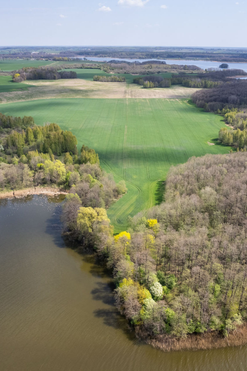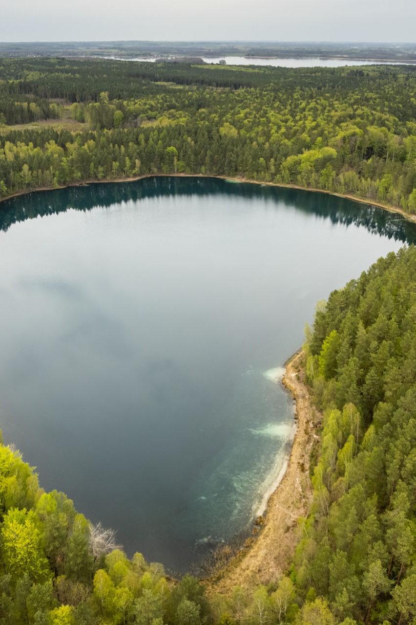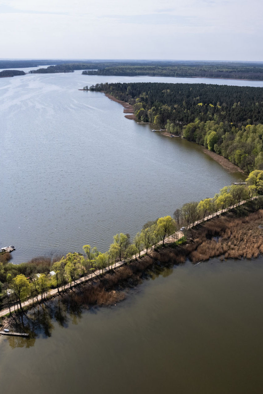 Jadąc dalej, musiałem na chwilę oddalić się od jeziora, bo tylko tak biegną drogi w kierunku wsi Wieprz i dalej na wyspę Bukowiec. Wyjeżdżając ze wsi Śliwa, szybko przestałem żałować tego objazdu, ponieważ do celu prowadziły mnie tak piękne aleje drzew, jakich w życiu nie widziałem. Na wyspę udałem się pieszo po grobli. Kiedy wróciłem było już samo południe, a okoliczne widoki nie zrobiły na mnie zbyt dużego wrażenia. Udałem się więc w kolejne miejsce, które zaznaczyłem sobie na mapie. Tu ważna uwaga: ten skok w bok jest tylko dla samochodów z wyższym zawieszeniem i najlepiej z napędem 4×4. Wszystko dlatego, że droga, początkowo szutrowa, z każdym metrem przeradza się w coraz bardziej leśną, a liczba dziur i nierówności rośnie wprost proporcjonalnie do pięknych widoków za oknem. Przeprawiałem się tam nie bez powodu. Chciałem odnaleźć ślady po dawnej pruskiej wsi Pomehlen, która jeszcze pod koniec XVIII w. składała się z 11 gospodarstw. Obecnie pod spolszczoną nazwą Pomielin nie sposób dojrzeć nawet pozostałości budynków w zaroślach. Tylko skarłowaciałe drzewa owocowe mówią o tym, że było tam kiedyś życie. Powtarzam jednak, że dojazd do tego miejsca jest wymagający, a po krótkiej wizycie w Pomielinie i tak wróciłem do drogi Wieprz – Śliwa i udałem się do wsi Dobrzyki, które z moich obserwacji są najdalej wysuniętym puntem Jezioraka na północ. Przedostałem się tym sposobem na zachodni brzeg i pojechałem do wsi Matyty, żeby zobaczyć Cieśninę Matycką. Podobnie na chwilę zajrzałem na plażę w Jerzwałdzie położonym nad Jeziorem Płaskim, które łączy się z Jeziorakiem. Mój pierwotny plan zakładał trzymanie się brzegu, ale na opłotkach wsi Jeziorno postanowiłem odejść od tego założenia. To wszystko za sprawą Jeziora Jasnego. Znajduje się ono na terenie rezerwatu przyrody „Jasne”, w którym sąsiadują ze sobą dwa różne i zarazem bardzo ciekawe ekosystemy. Pierwszym z nich jest ubogie we florę i faunę Jezioro Jasne. Natomiast drugie, Jezioro Lube, jest jego totalnym przeciwieństwem. W okolicach wsi Jeziorno z parkingu przy drodze można ścieżką przejść przez las aż nad brzeg jeziora, którego wody są krystalicznie czyste. Funkcjonuje ono zamiennie pod nazwą Jezioro Czyste lub Jasne, ale obie te nazwy bardzo trafnie oddają jego klimat. Stojąc na skraju brzegu, można na odległość kilku metrów bez problemu dostrzec piaszczyste dno. Według pomiarów światło przebija się w nim przez wodę na głębokość około 15 m. Docierając natomiast nad pobliskie Jezioro Lube, od razu można zauważyć, że jest ono gęsto zarośnięte przez lilie wodne, a na torfowiskach przy brzegu rośnie rosiczka okrągłolistna, turzyca czy mech torfowiec. To wszystko skusiło mnie na tyle, że wybrałem się na ponadgodzinny spacer po lesie.