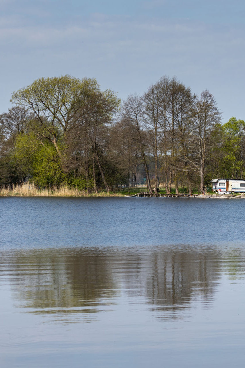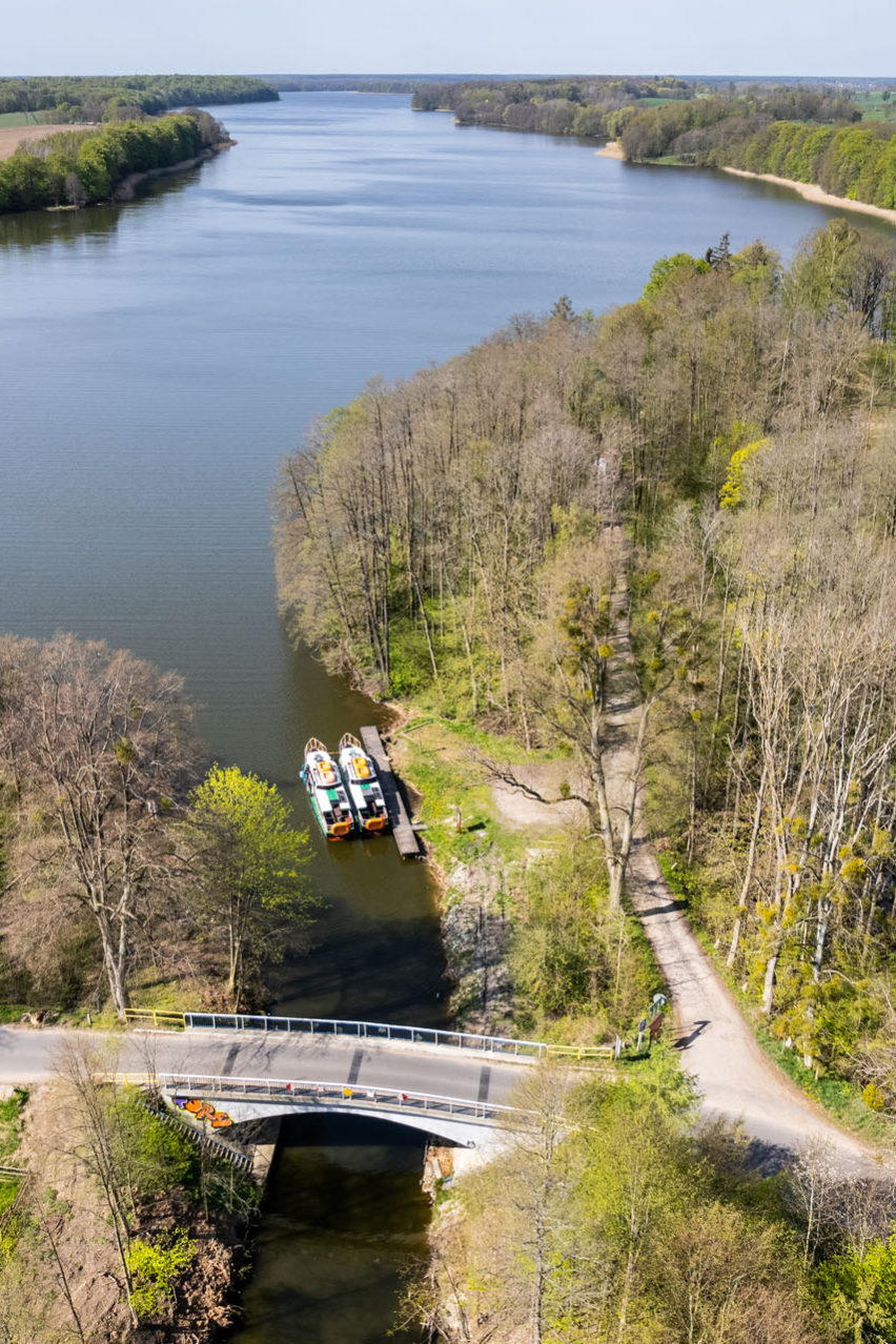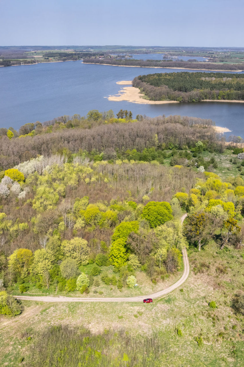 Wracając na trasę, bardzo chciałem dostać się do miejsca, w którym Jezioro Płaskie łączy się z Jeziorakiem. Odnalazłem na mapie miejsce obok wsi Jeziorno i dojechałem tam najgorszą z możliwych dróg, czyli zarośniętą i dziurawą. Na miejscu okazało się, że jest też nieutwardzona, ale dużo lepsza droga, która prowadzi do wsi Siemiany. Do tego miejsca sugeruję dojechać właśnie w ten sposób, nadkładając kilka kilometrów. Jadąc dalej przystanąłem na chwilę w Siemianach przy wieży widokowej i zszedłem na plażę „Na skarpie”, która zasadniczo powinna nazywać się „Pod skarpą”. Z mapy jasno wynikało, że dla miłośnika slow drivingu od tego miejsca dostęp do brzegu będzie bardzo utrudniony. Drogi, choć są na mapie, to często w rzeczywistości są to drogi leśne z zakazem wjazdu. Nie chciałem zostać gwiazdą fotopułapek w nadleśnictwie, więc podarowałem sobie dalsze poszukiwania. Tylko raz jeszcze zjechałem w stronę jeziora, kierując się do osady Łanioch, gdzie jak się okazało, znajduje się ośrodek wypoczynkowy TVP. Tam w jednym miejscu udało mi się dojść do jeziora, ale nie wiem, czy do końca legalnie, ponieważ przeszedłem przez pole namiotowe, które choć było oznakowane, to nie było ani ogrodzone, ani dozorowane.